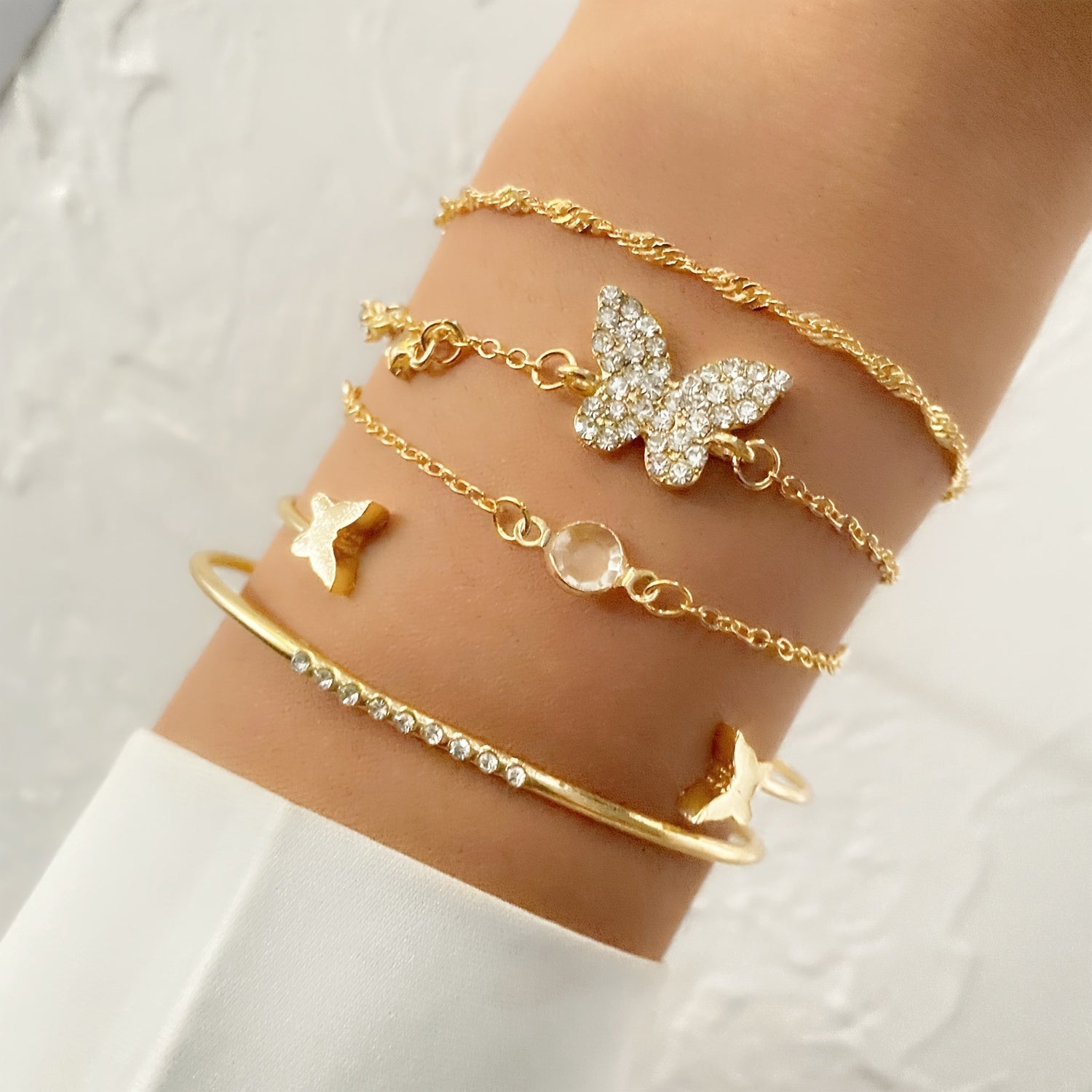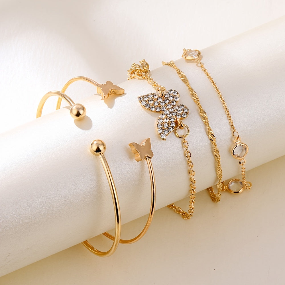 Add a touch of glamour with this set of 5 golden butterfly cuff bangle bracelets featuring glitter and rhinestone accents.