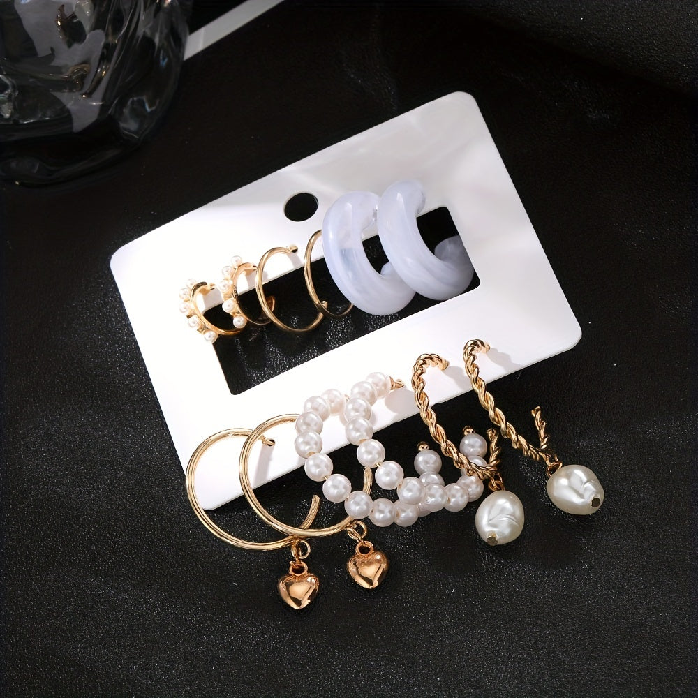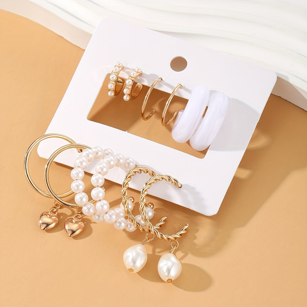 Add a touch of Japanese style to your outfit with this set of 6 pairs of golden hoop earrings featuring faux pearl decoration. Made from high-quality alloy, these earrings are a perfect gift for any female.