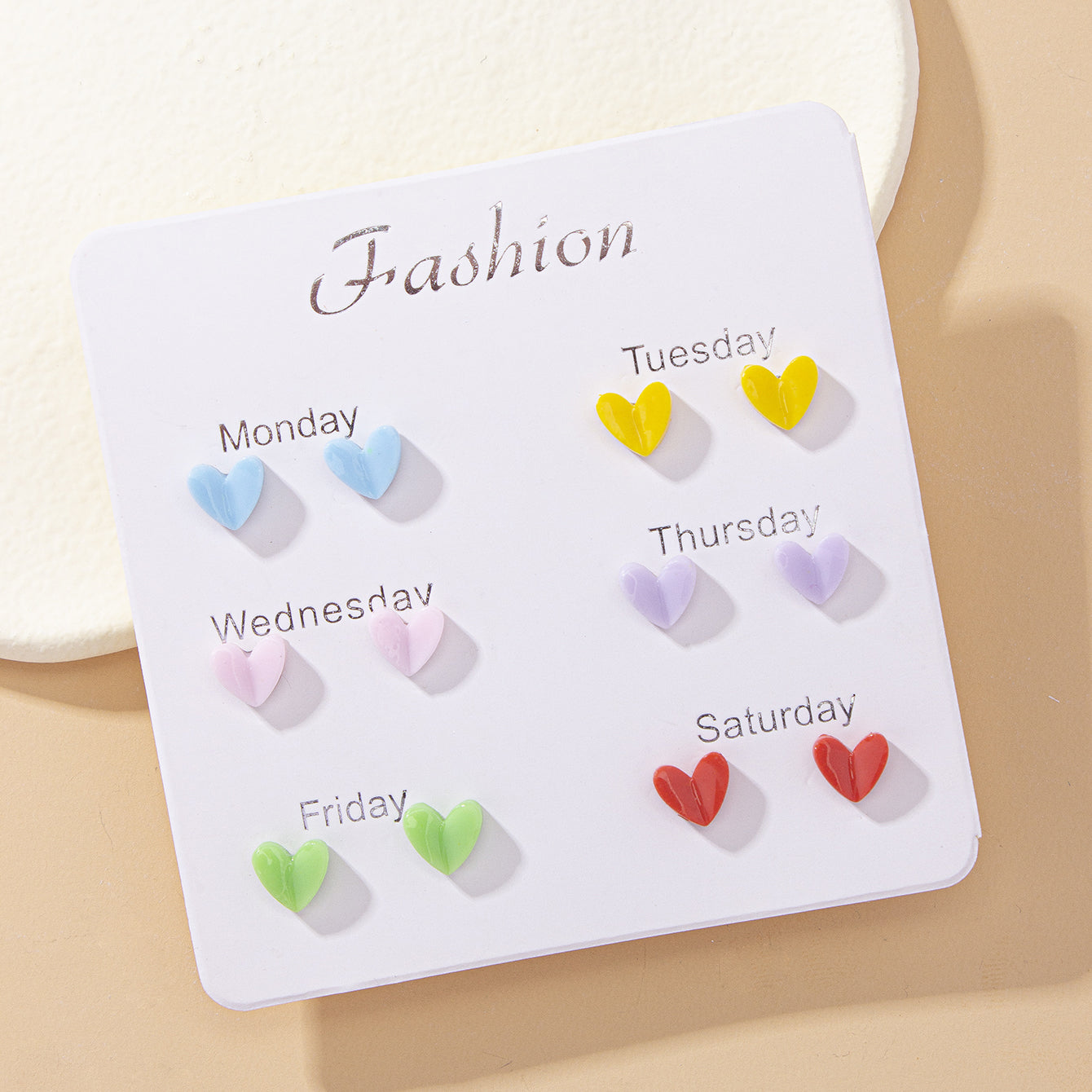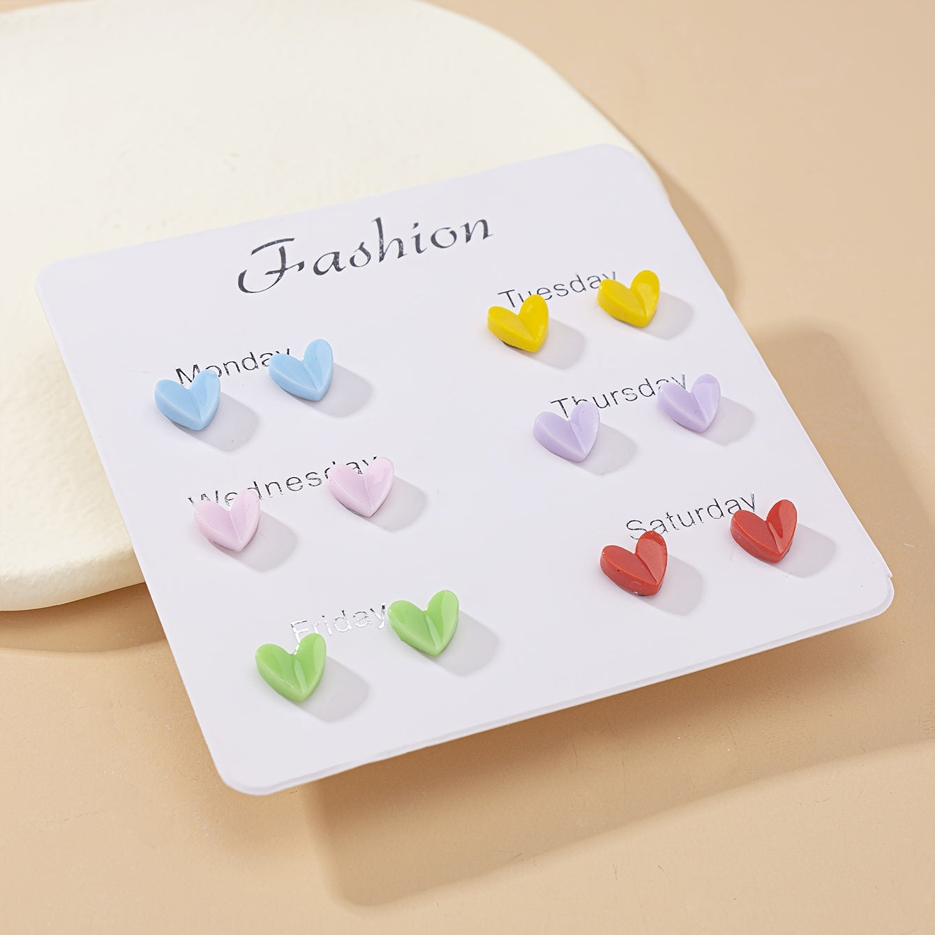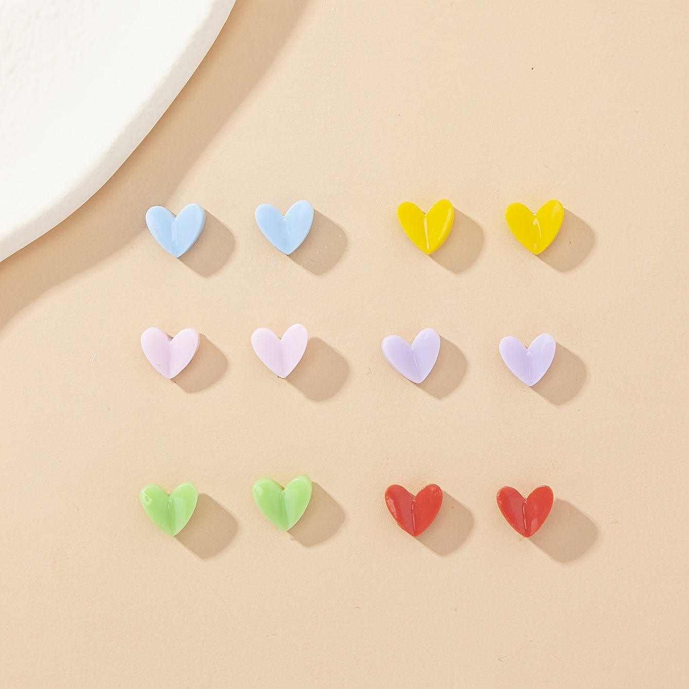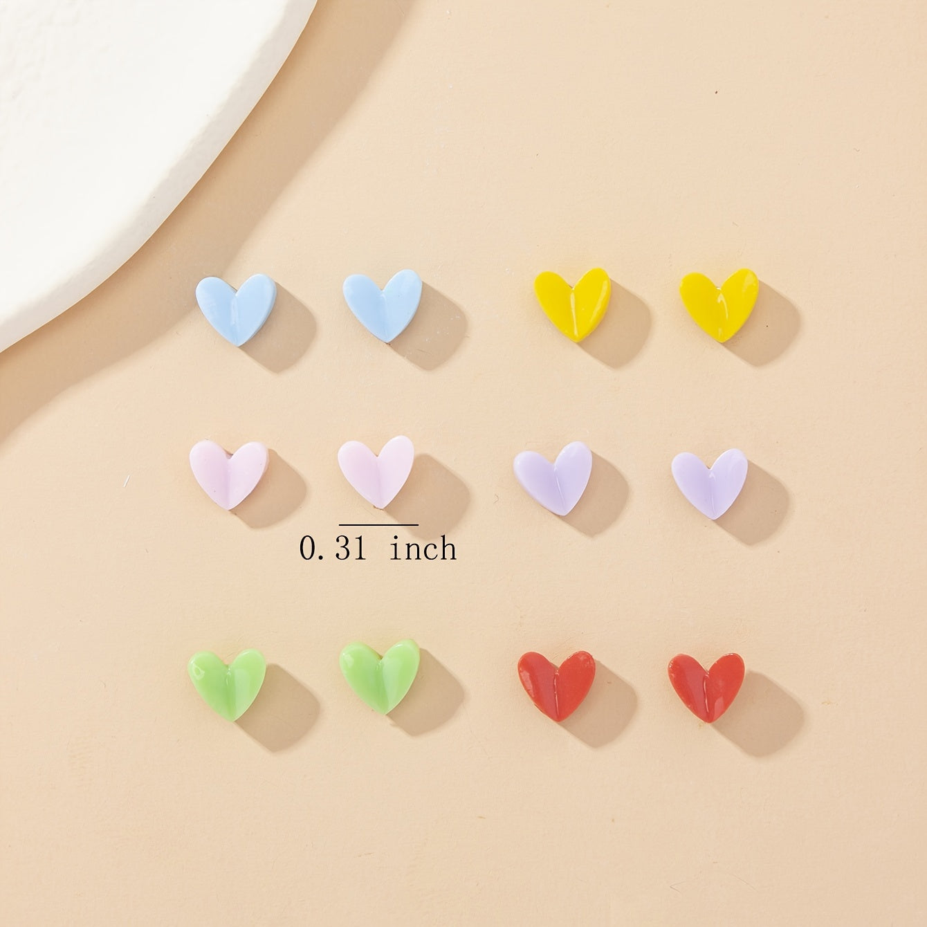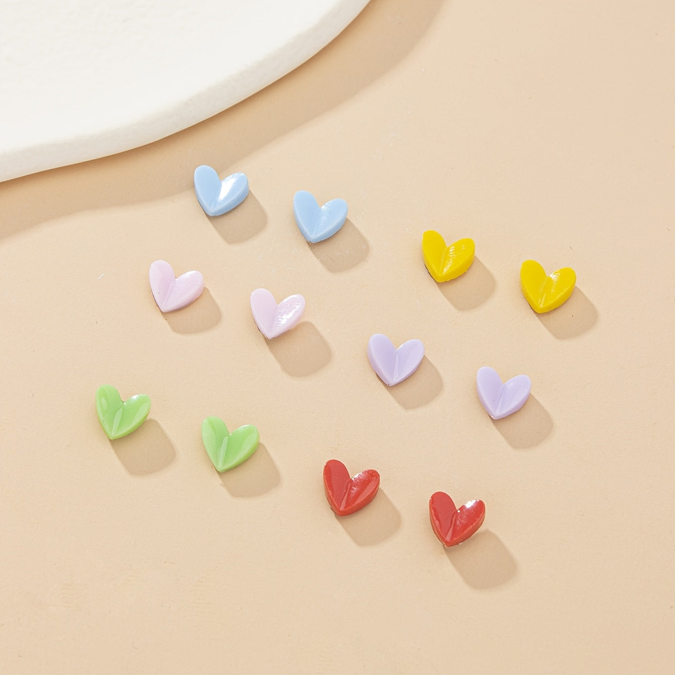 This set includes 6 pairs of small love stud earrings in various colors of resin. Perfect as a gift for women who love unique jewelry pieces.