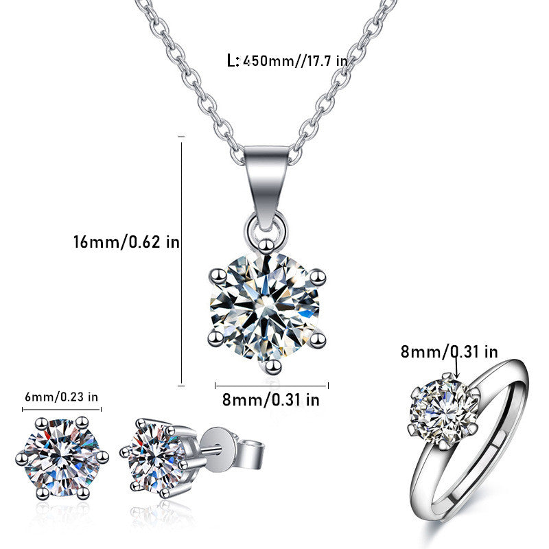 Complete your elegant look with this stunning 6 prong zircon jewelry set. Perfect for weddings, banquets, and proms, this set includes earrings, a necklace, and a ring, all plated in silver.
