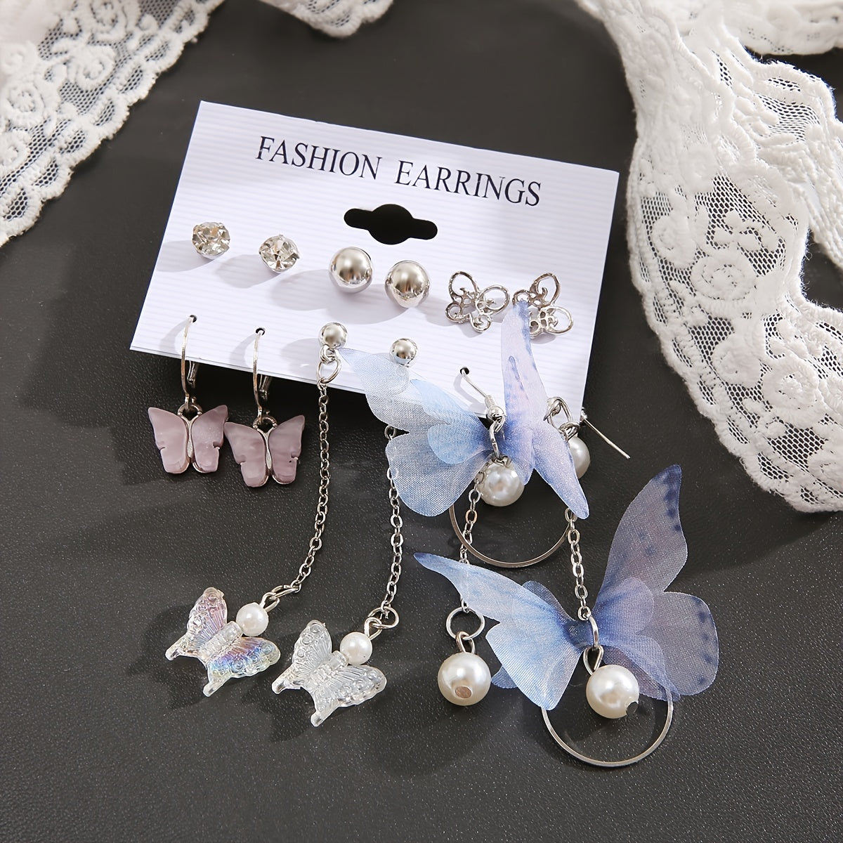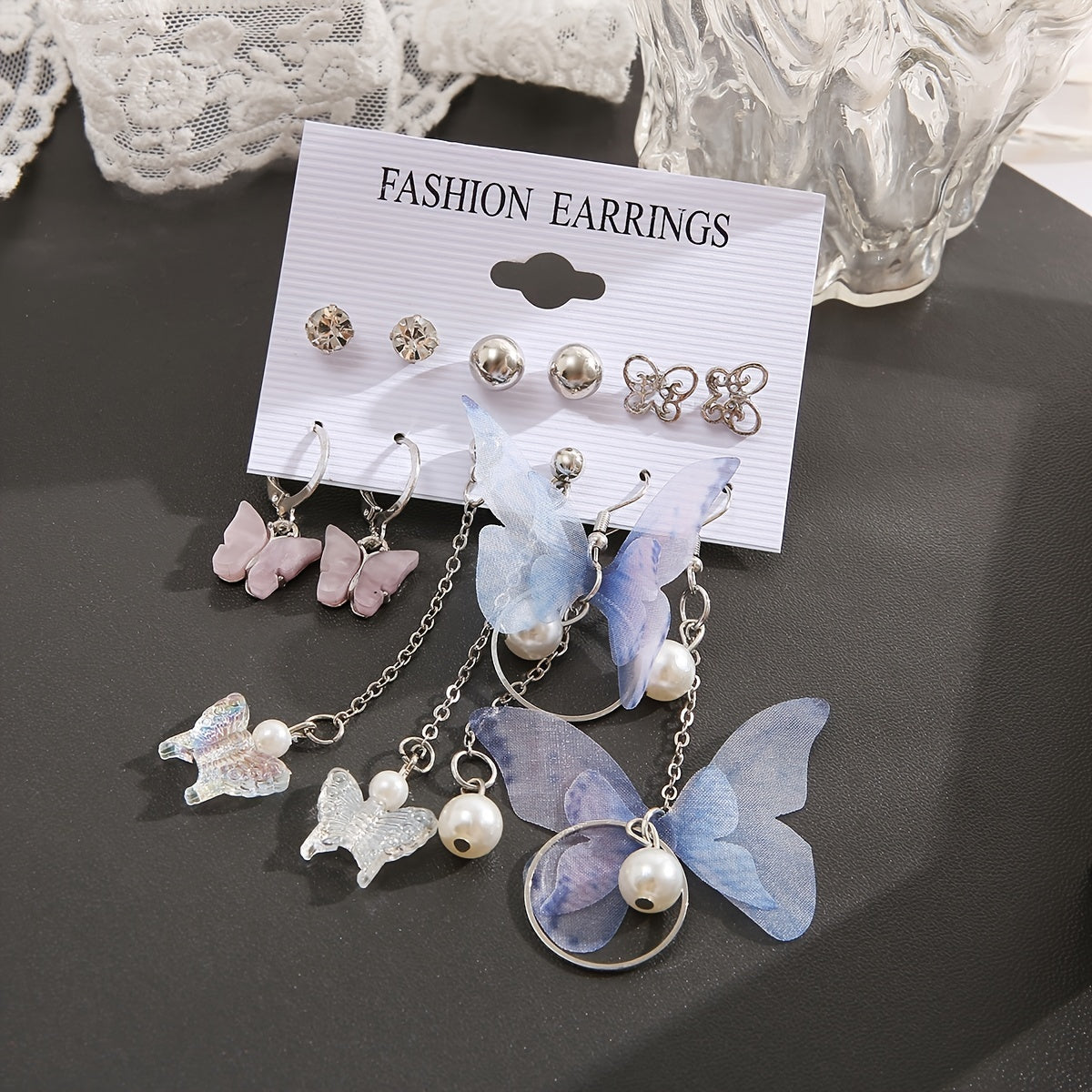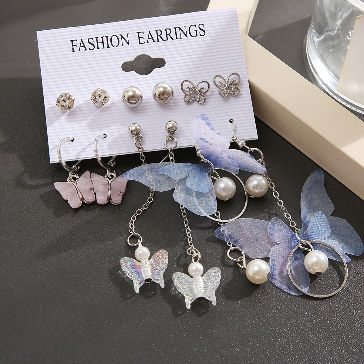 6Pairs Asymmetric Butterfly Faux Pearl Dangle Earrings Set