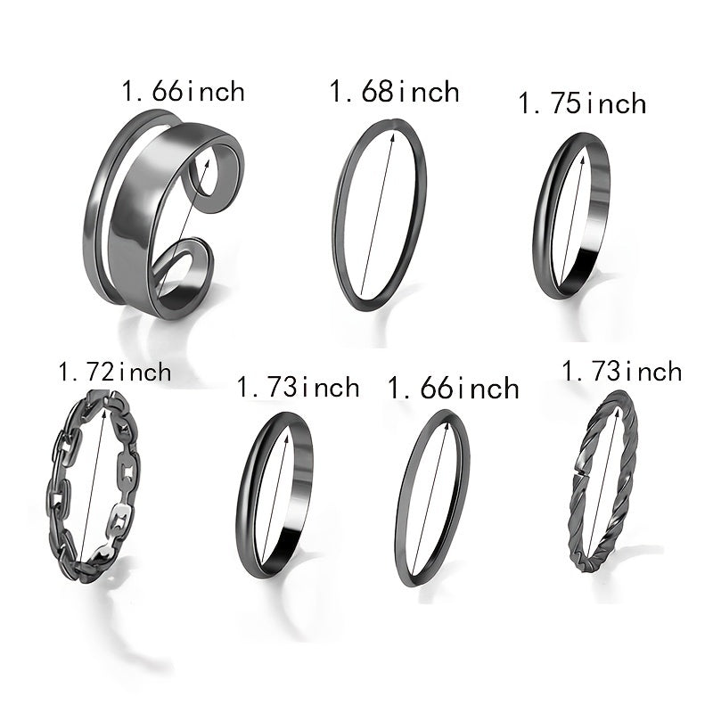 Make a bold statement with this 7-piece set of punk style band rings. Perfect for stacking and can be worn individually for a unique look.