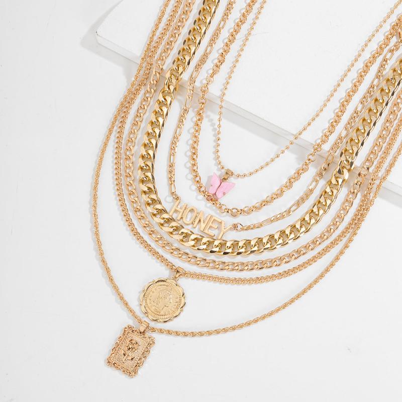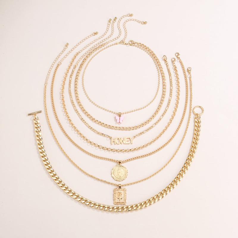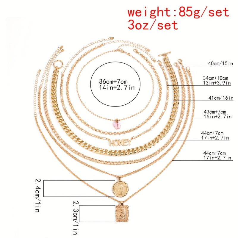 Add a touch of vintage charm to your outfits with this 7-piece necklace set featuring metal pendant designs.
