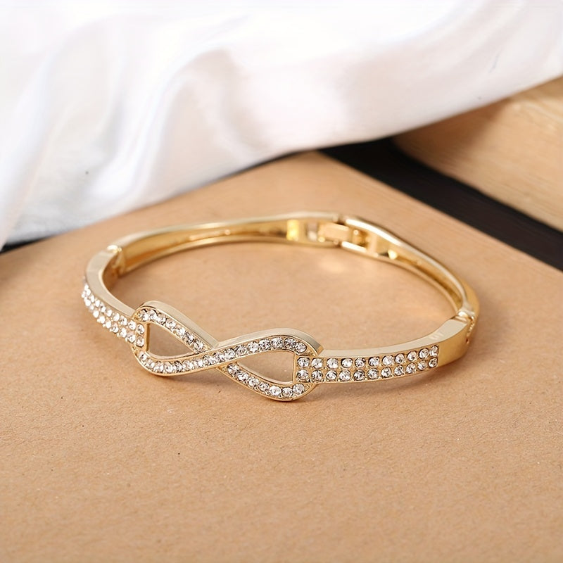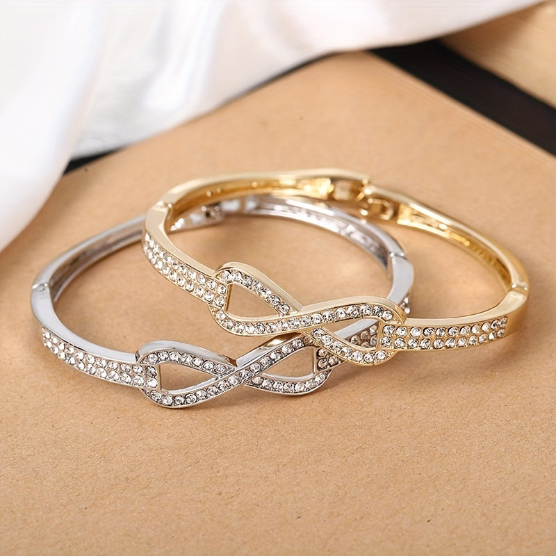 This stunning 8 shaped cuff bangle bracelet features inlaid synthetic gems, making it a versatile piece of jewelry that can be worn with any outfit. It adds a touch of elegance and sparkle to your look.