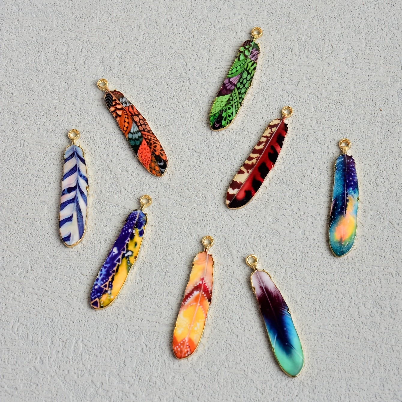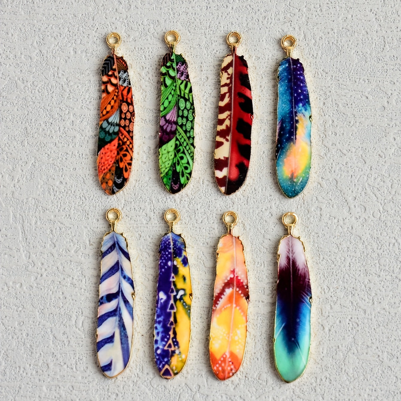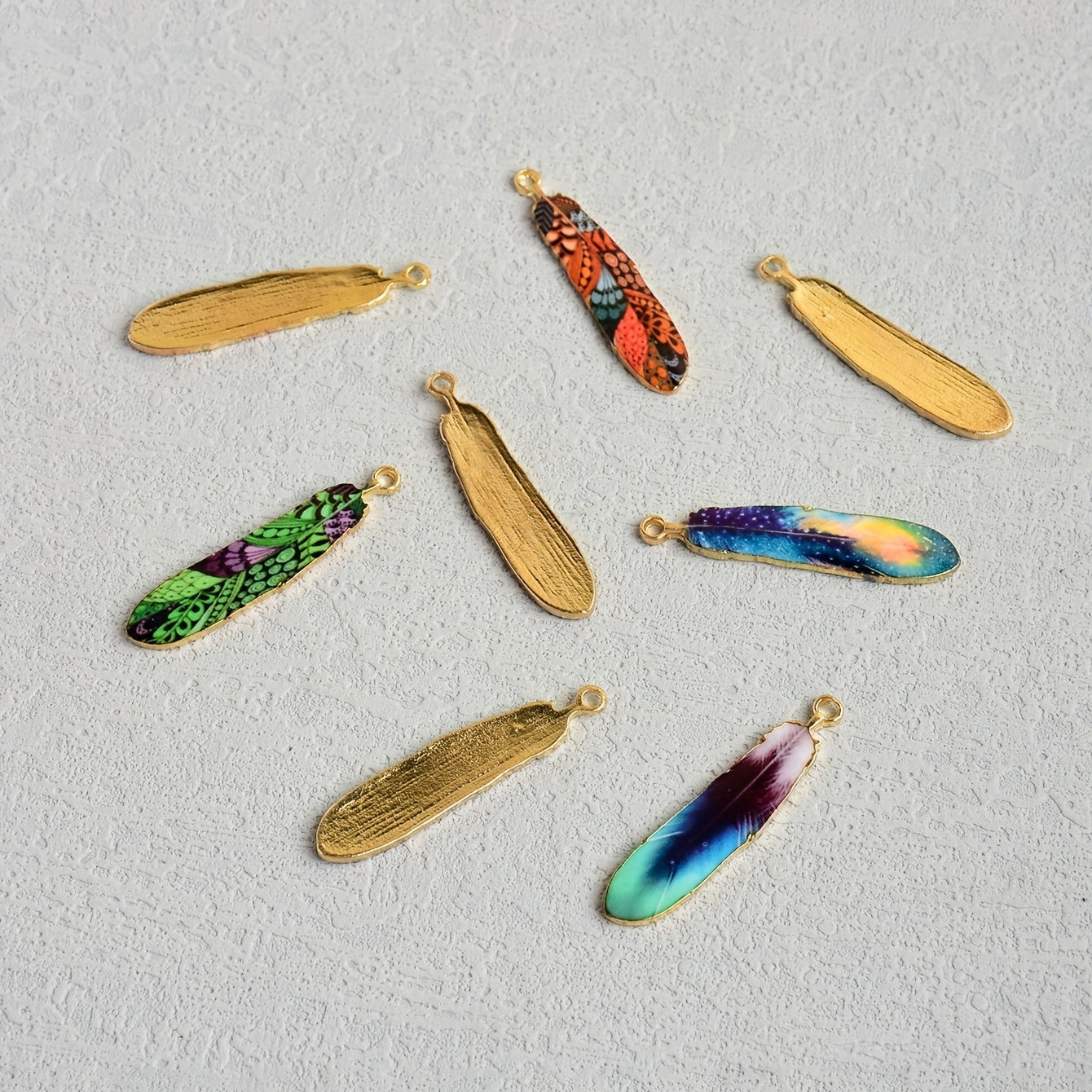 This pack includes 8pcs of ethnic style feather pendant alloy accessories, perfect for earrings, necklaces, bracelets, and key chains.