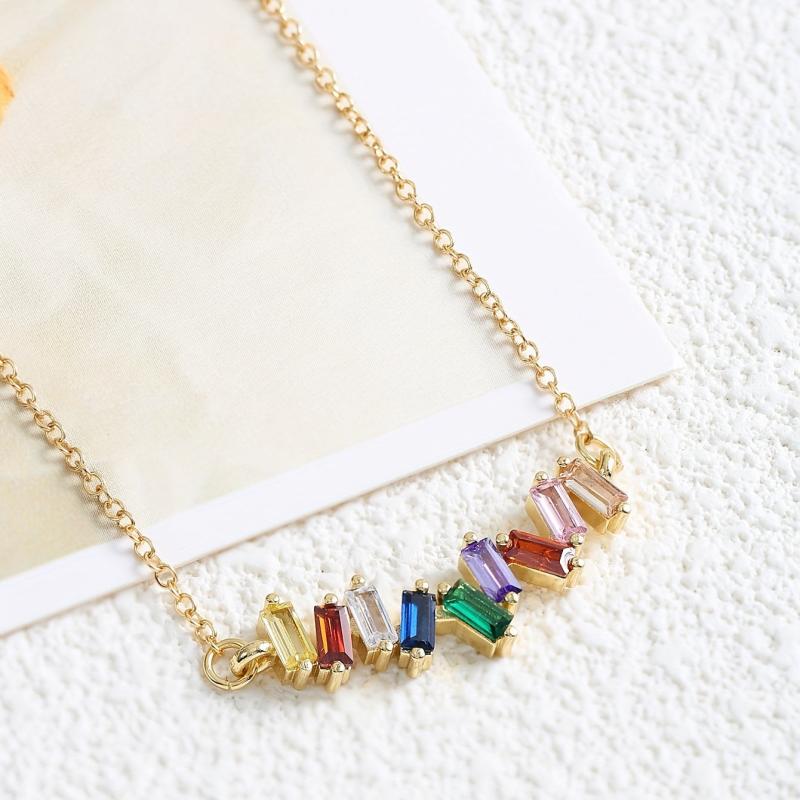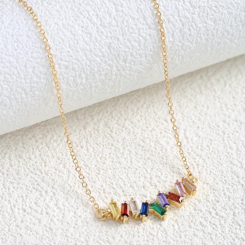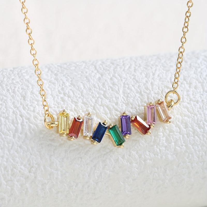 Elegant square pendant featuring nine colored zirconia stones. Perfect for adding a pop of color to any outfit.