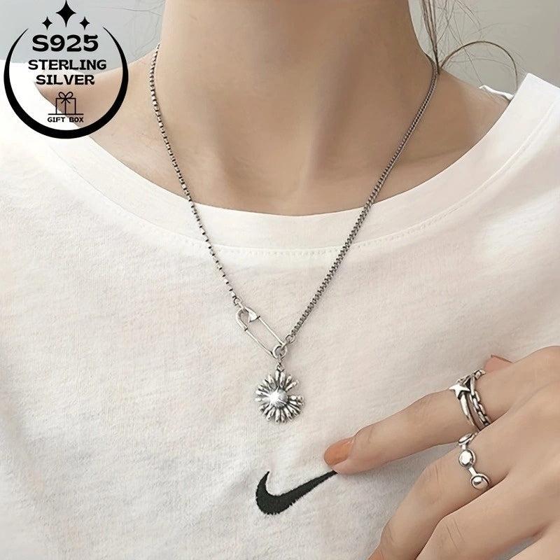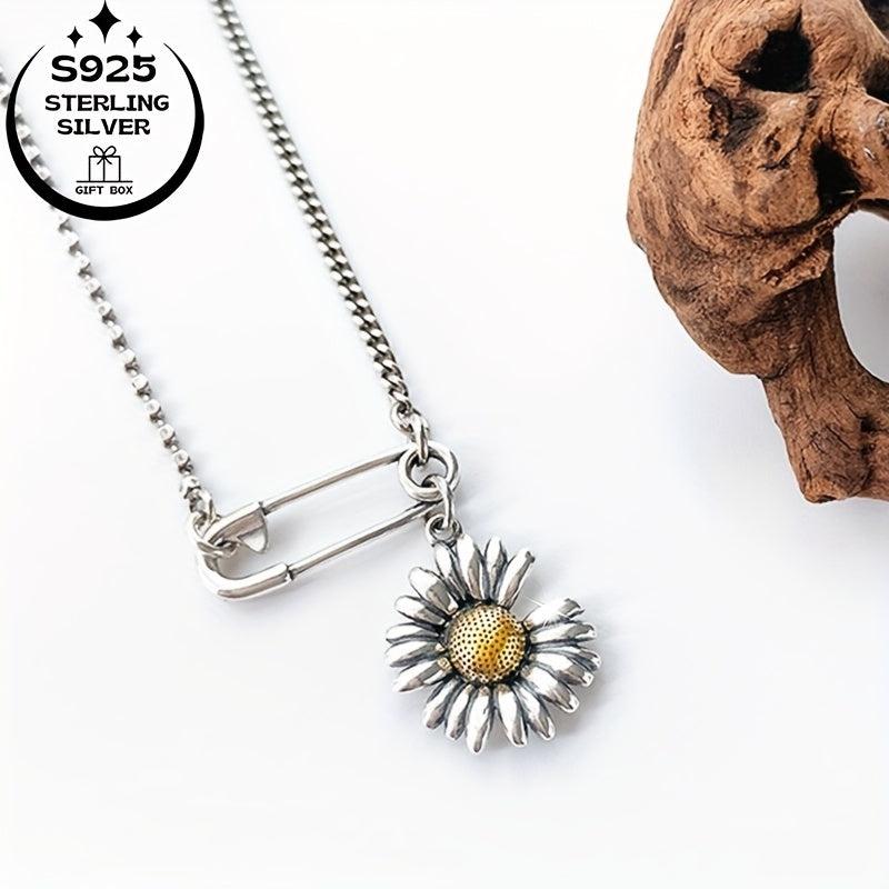 This delicate clavicle necklace features a vintage patina sunflower charm in 925 silver. Perfect for adding a touch of nature-inspired style to your outfit.