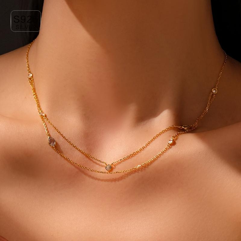 925 Silver Double Layer Necklace with CZ Drop & Round - Hypoallergenic Jewelry
