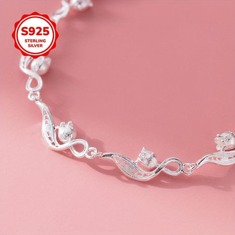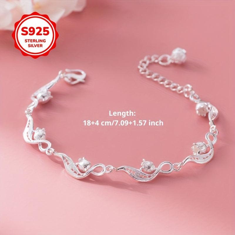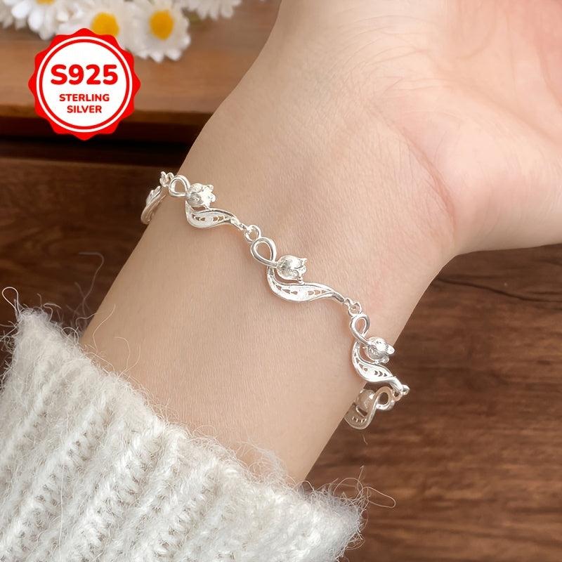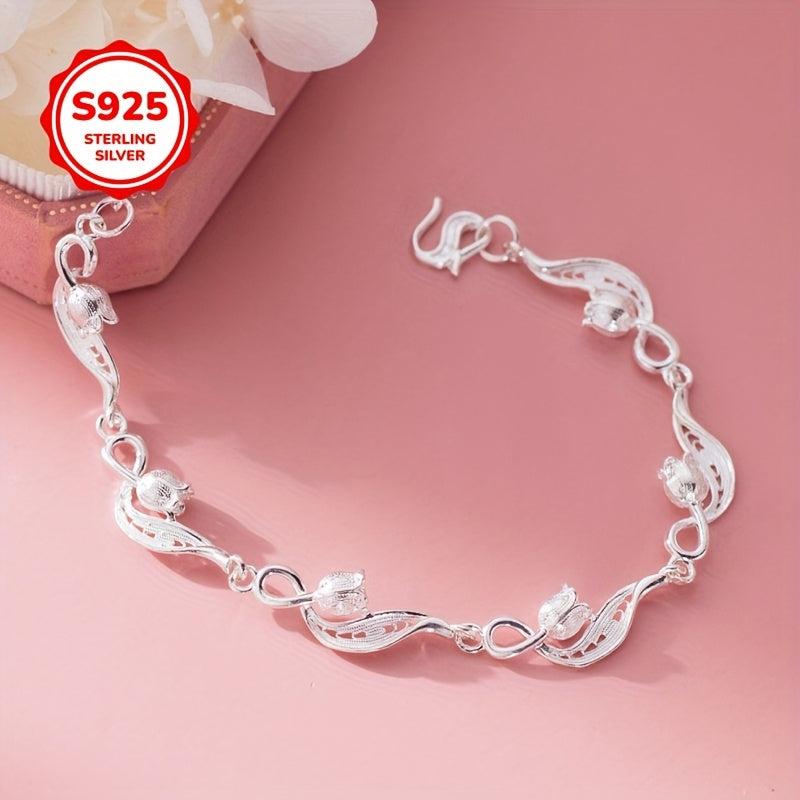 This 925 sterling silver bracelet features a beautiful Lily of the Valley design with charming accents. It is hypoallergenic and perfect as a gift for Valentine's Day or Mother's Day. The bracelet is oxidation-resistant and comes with a storage pouch.