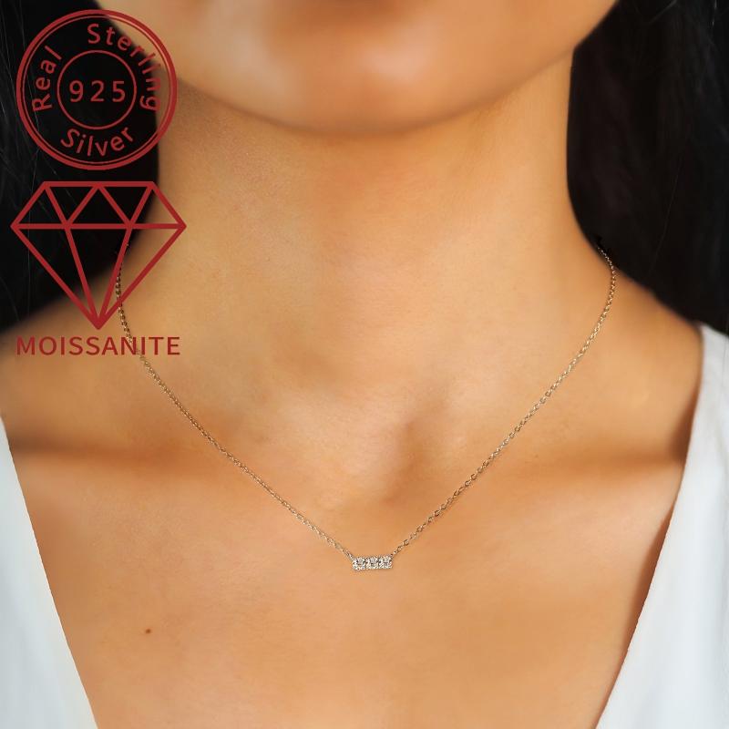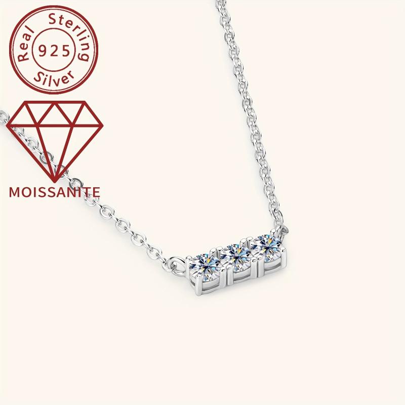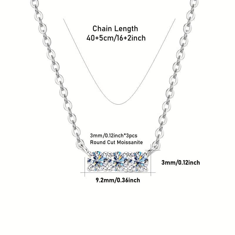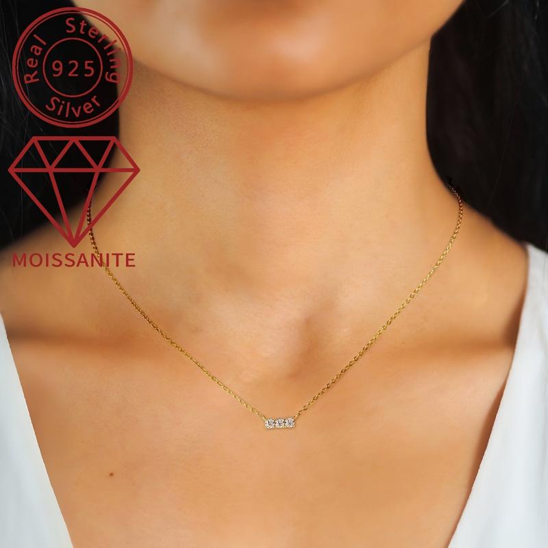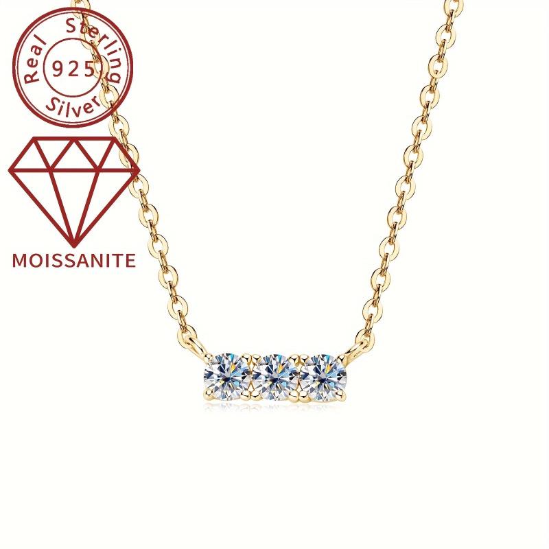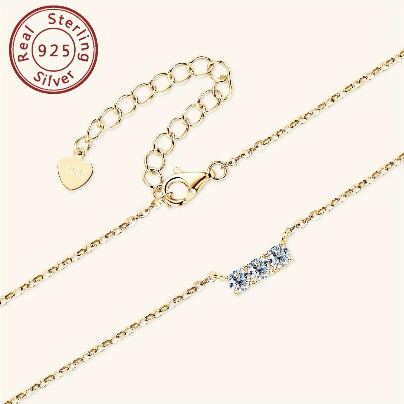 This elegant necklace features three sparkling moissanite stones set in a 925 silver pendant plated with 14K gold. Perfect for weddings or everyday wear.