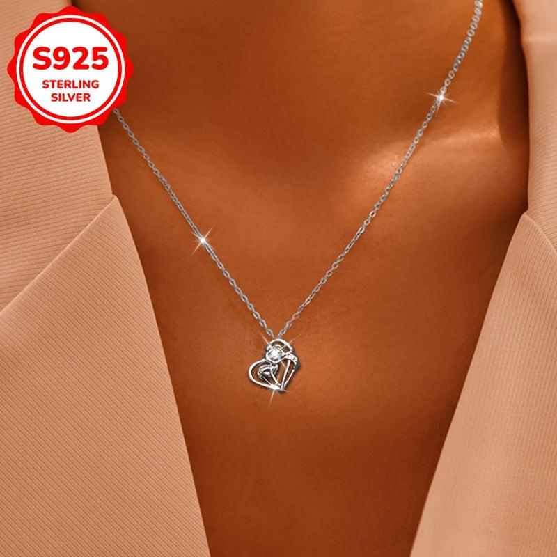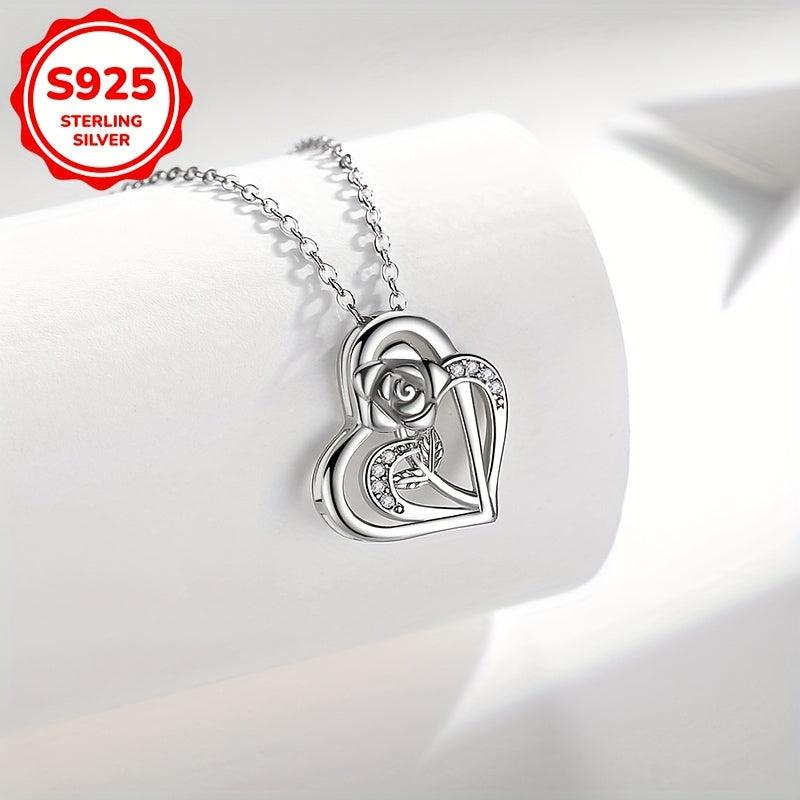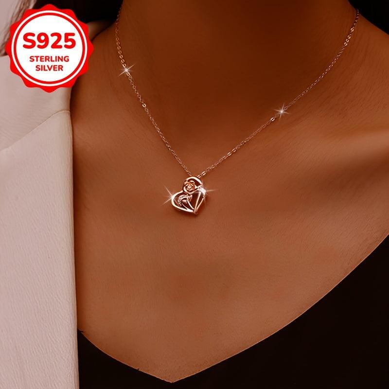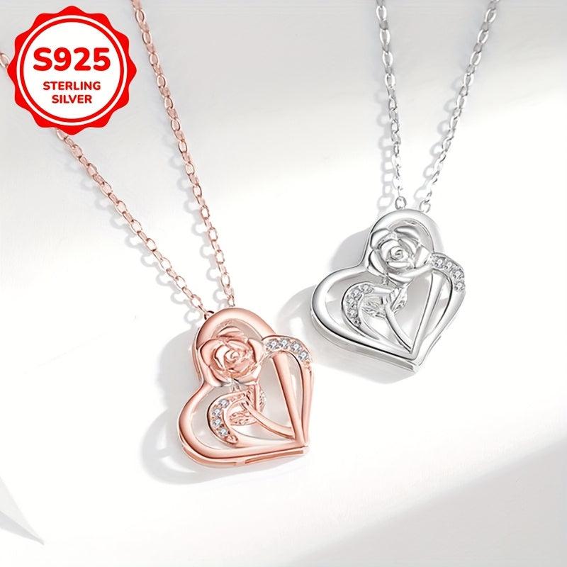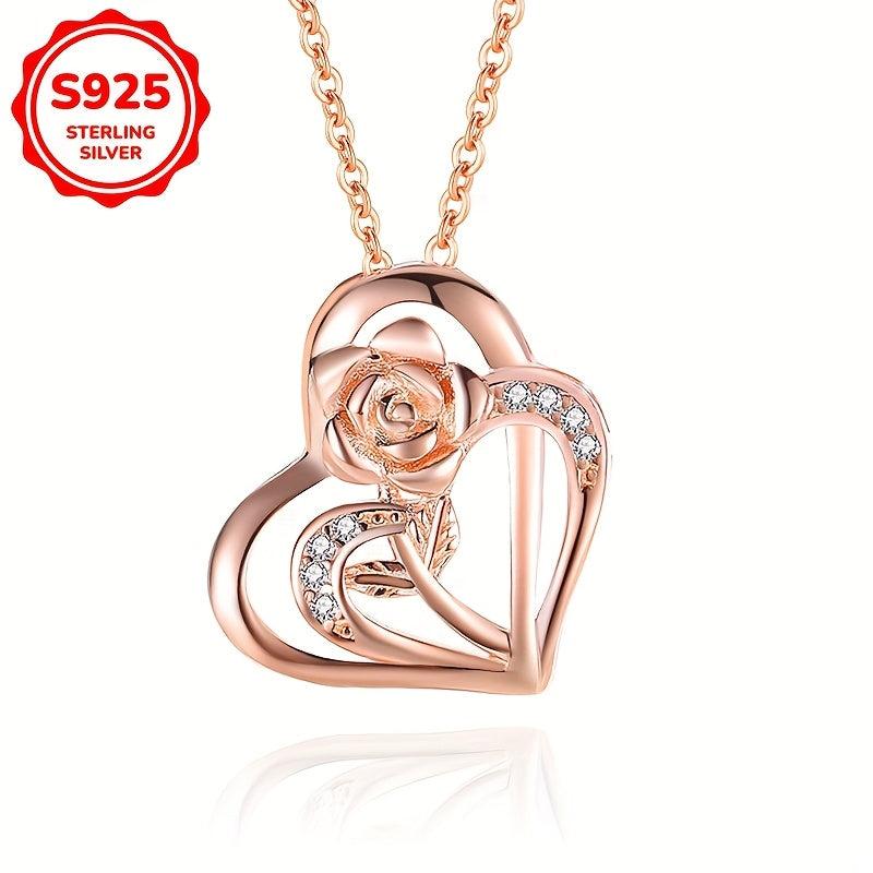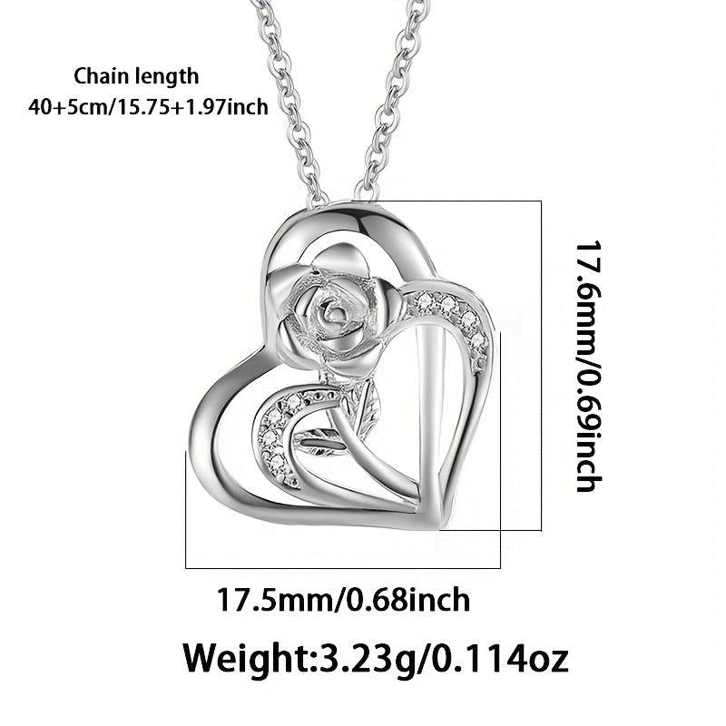 This pendant necklace features a dual heart and rose design with synthetic cubic zirconia. It is lightweight at 3.23g, making it perfect for daily wear or as a gift for Mother's Day.