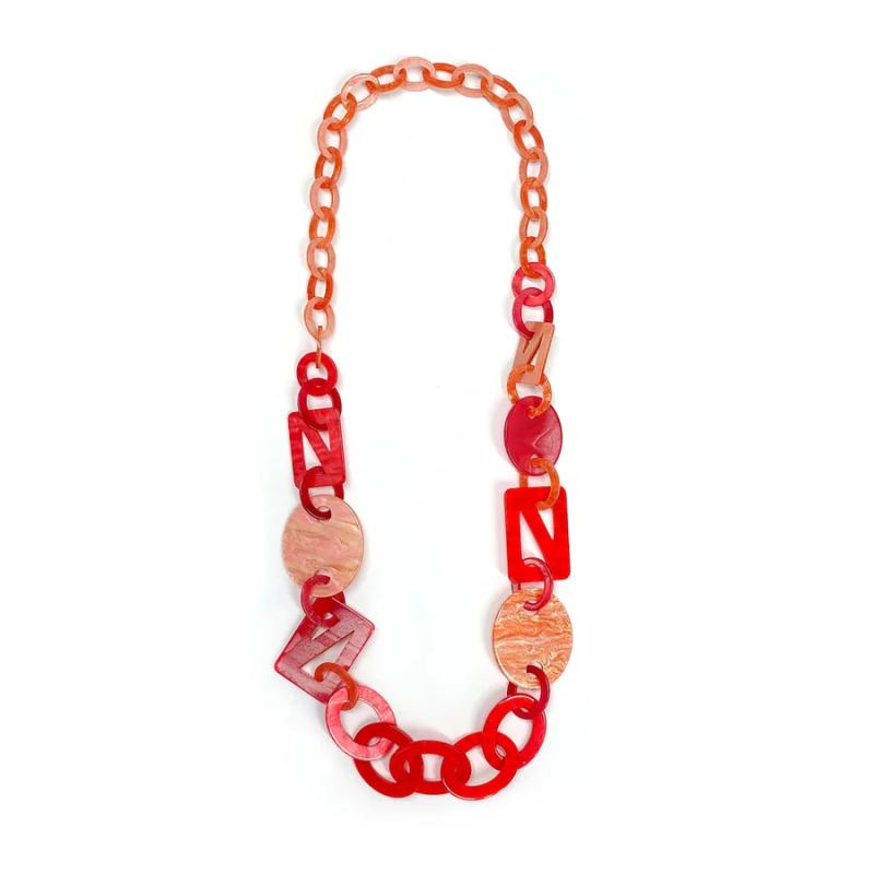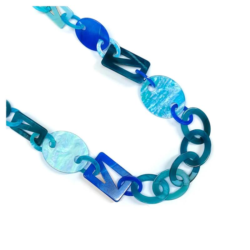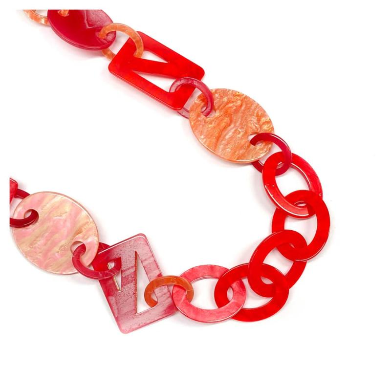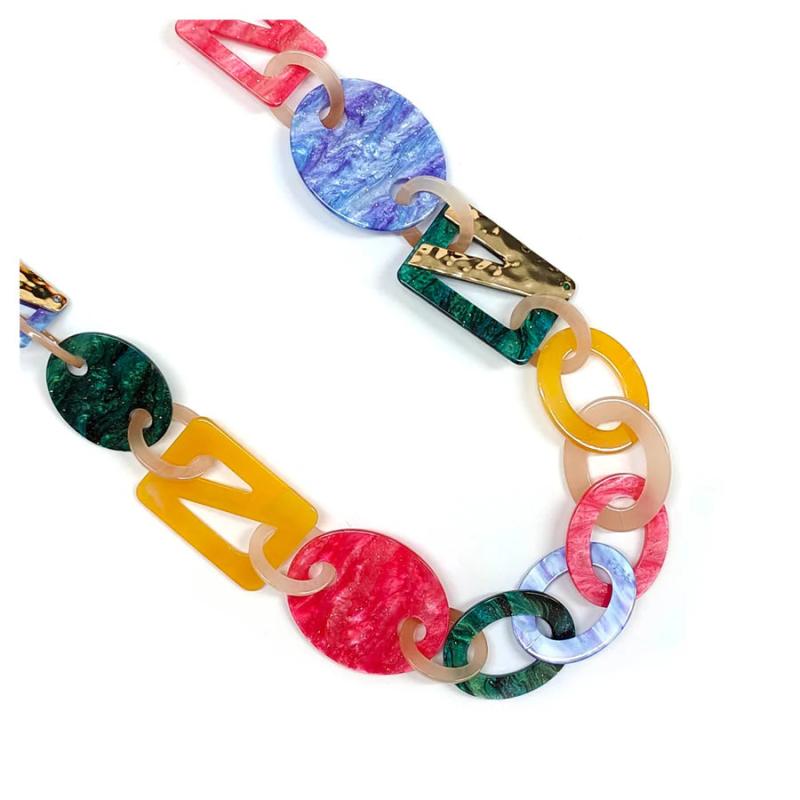Add a pop of color and style to your outfit with this bold acrylic chain necklace featuring unique shapes. The long length makes it versatile for any occasion.