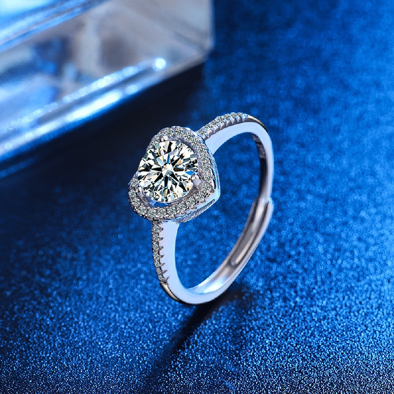 This sparkling engagement ring features a love heart design with inlaid cubic zirconia stones. The ring is adjustable to fit any finger size.