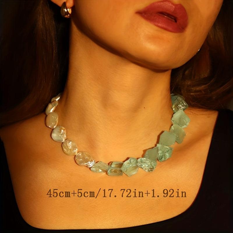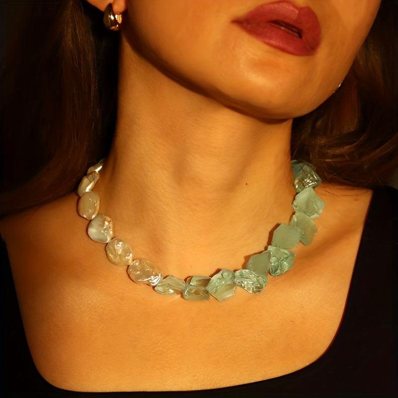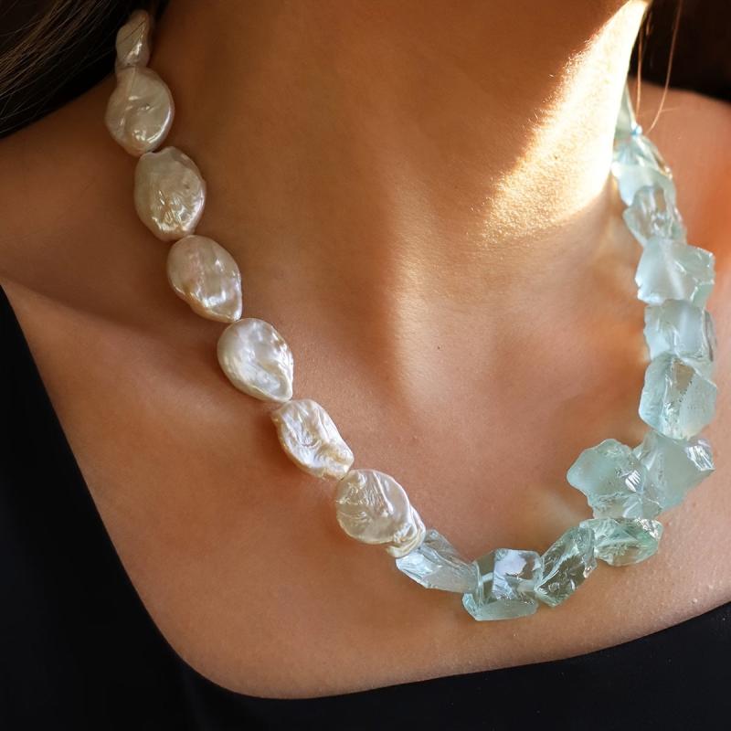 Elegant boho jewelry featuring aquamarine pearls and green crystals.