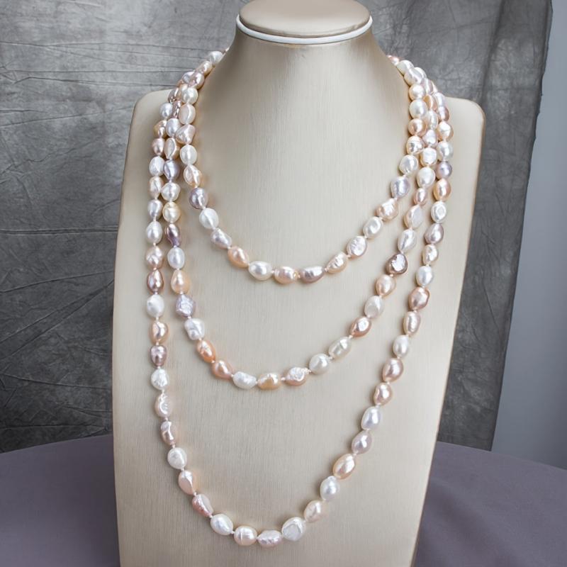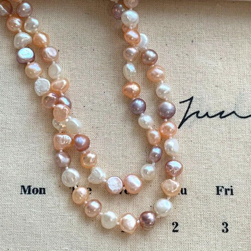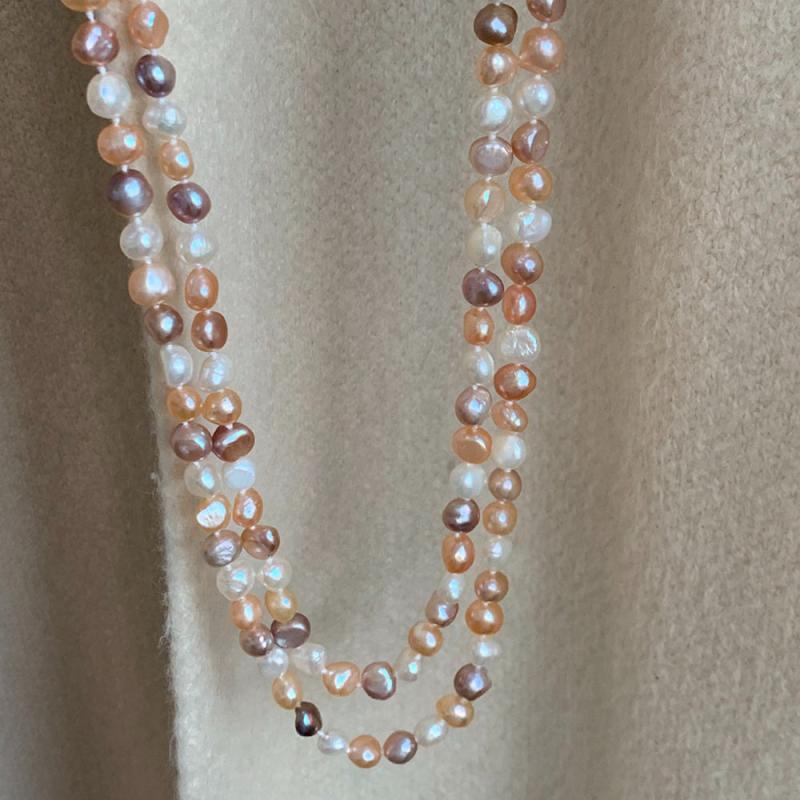 Elevate your look with this chic 63in long freshwater pearls necklace featuring baroque style mixed pearls in champagne and lavender hues. A minimalist layered jewelry piece that adds a touch of elegance to any outfit.