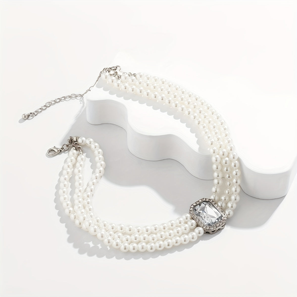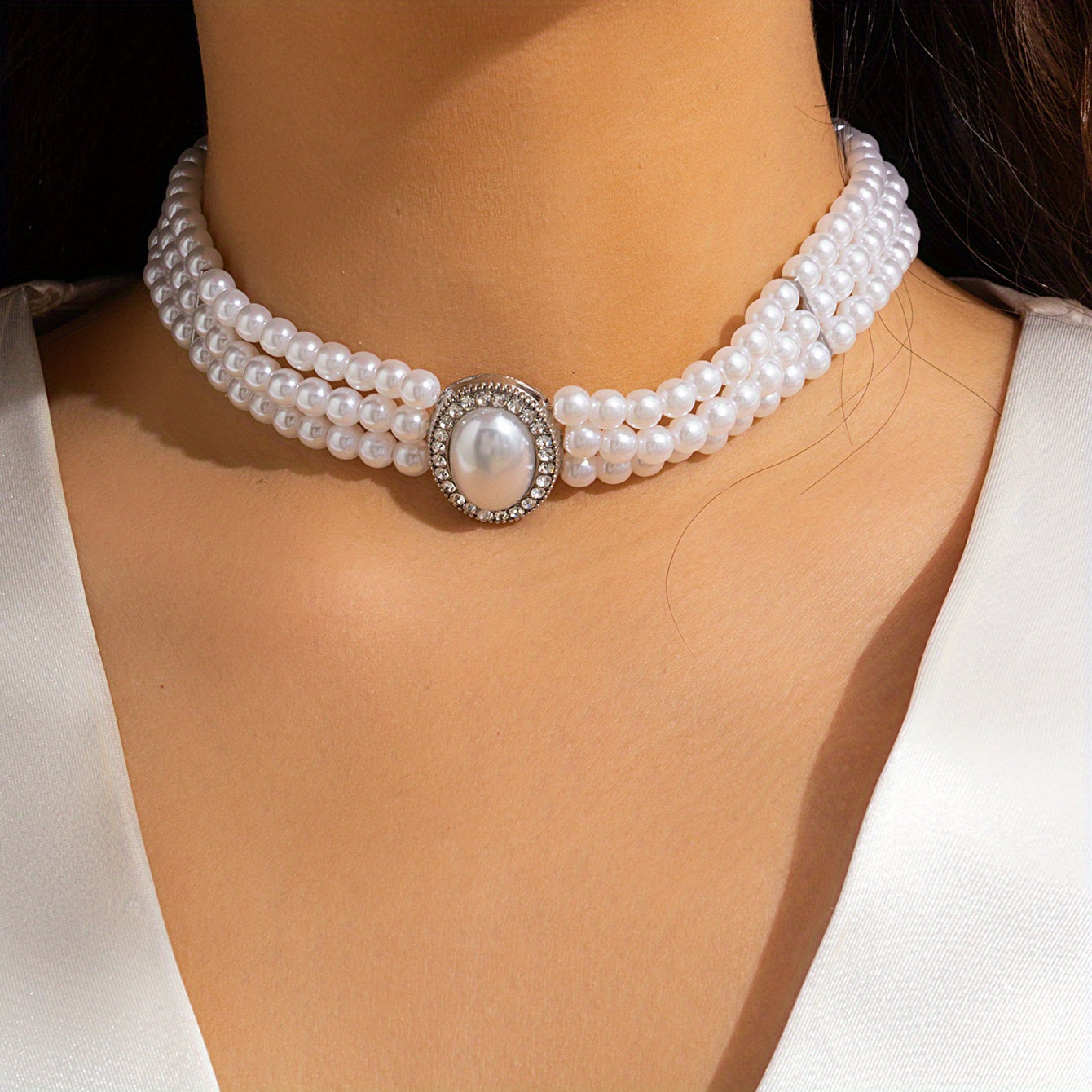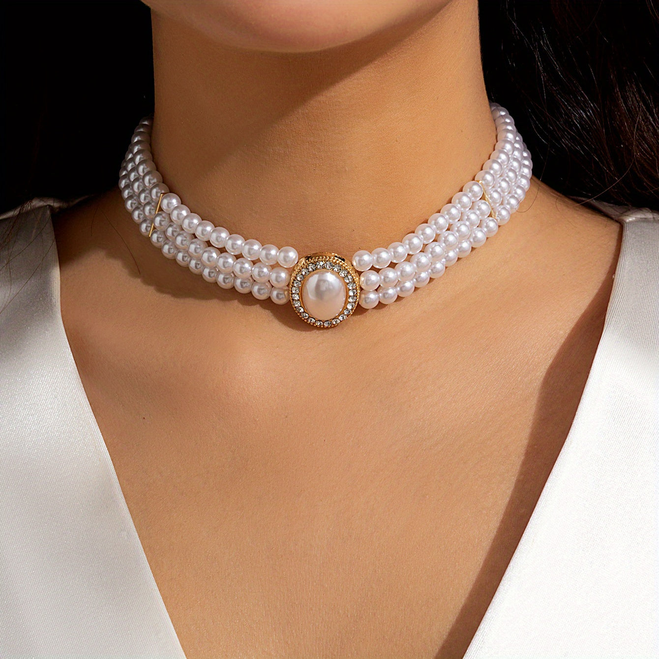 Add glamour to your party outfit with this multilayer choker necklace featuring faux gemstones and faux pearls. Perfect for special occasions.