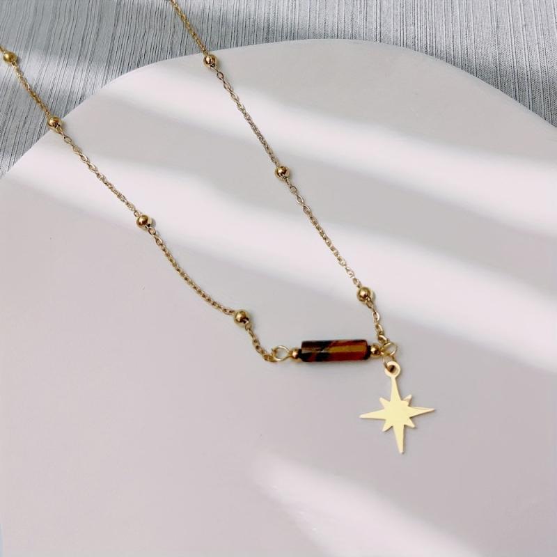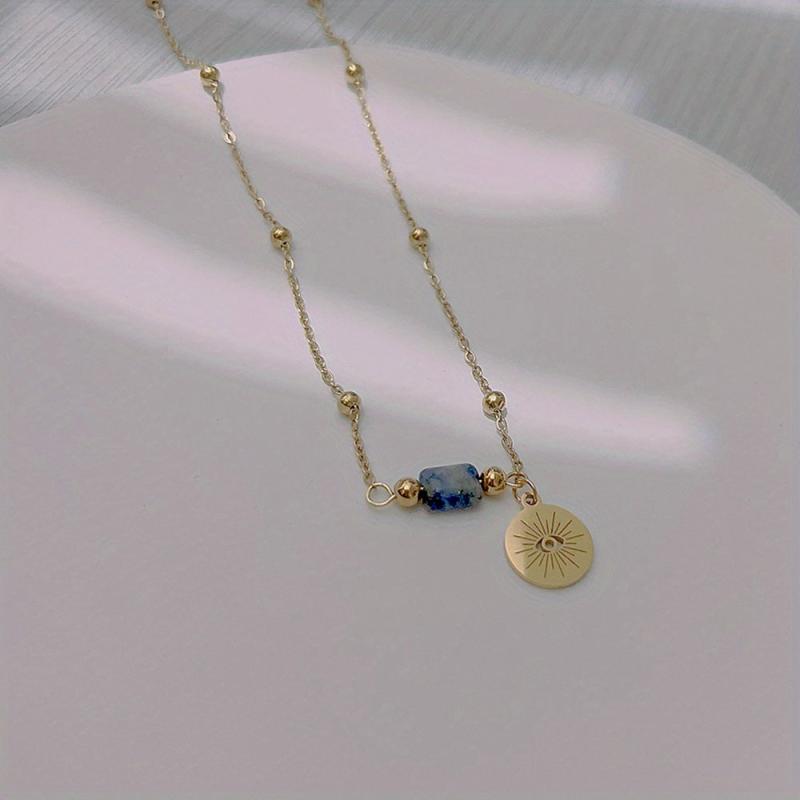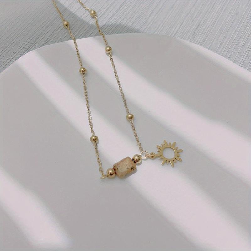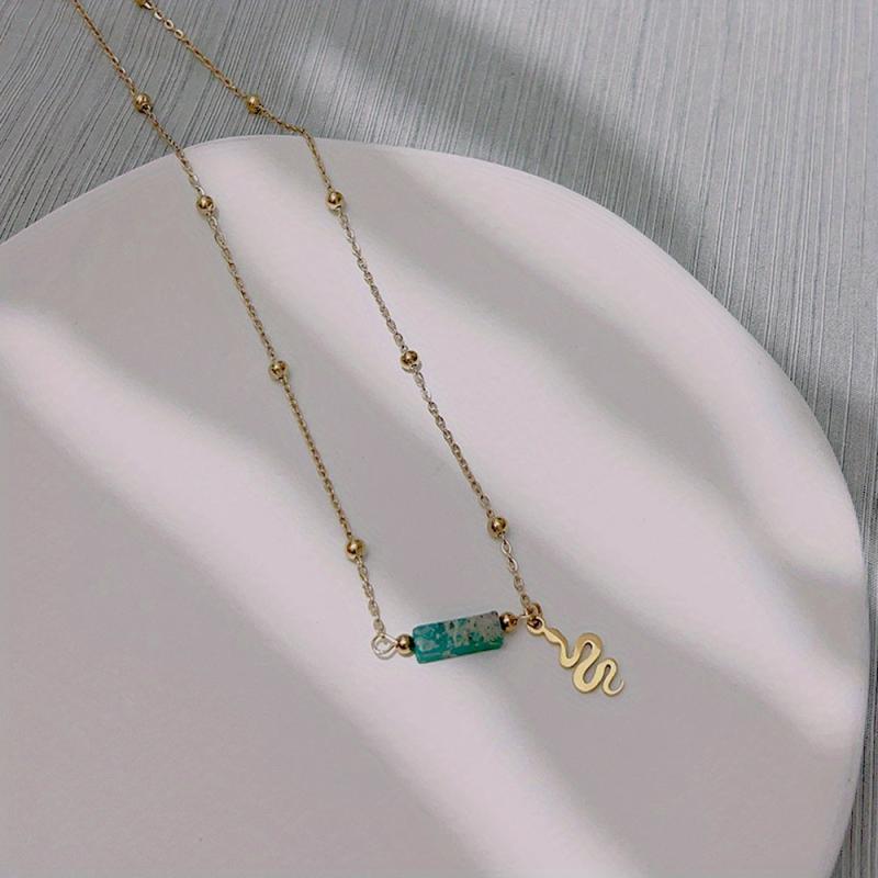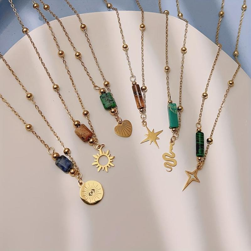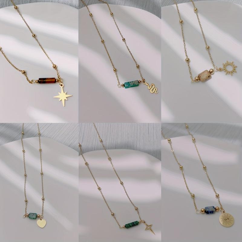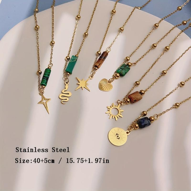 Elevate your style with this vintage square pendant necklace featuring a natural stone and geometric design in golden stainless steel. Perfect for adding a touch of bohemian charm to any outfit.