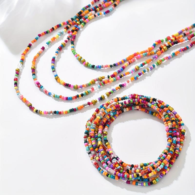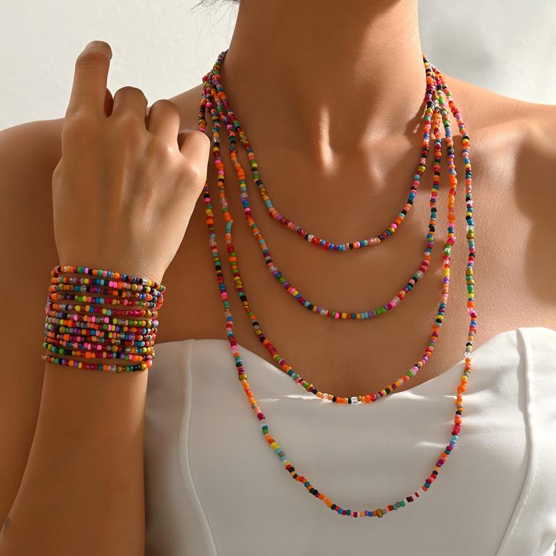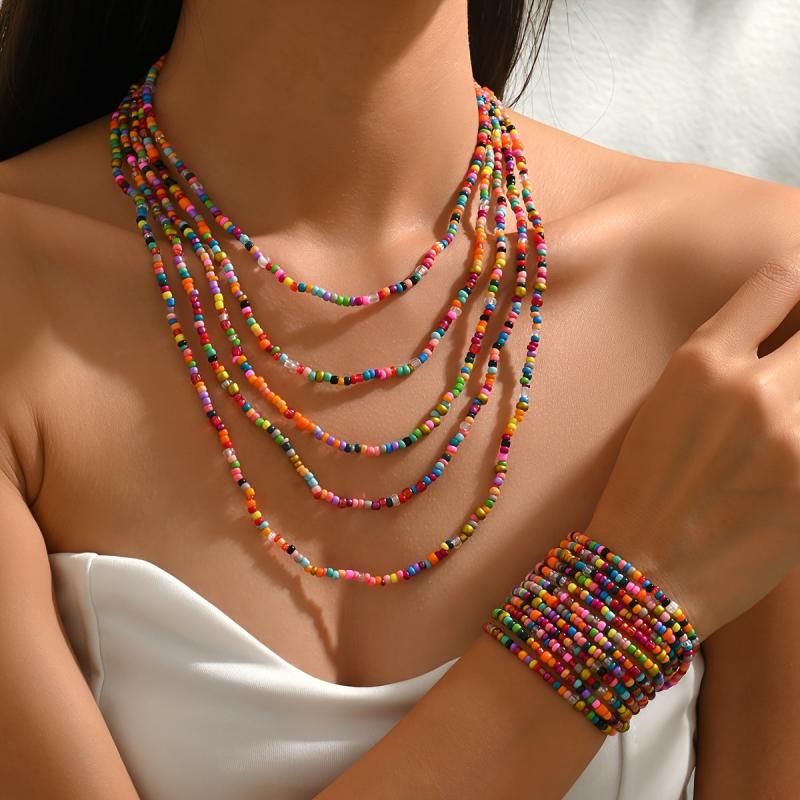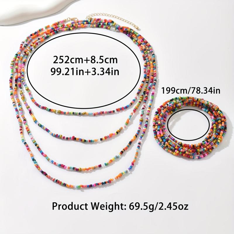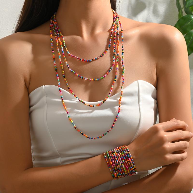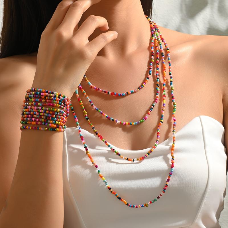 Elevate your style with this colorful beaded long layered necklace and bracelet set. Perfect for daily wear and to add a touch of bohemian charm to your outfit.