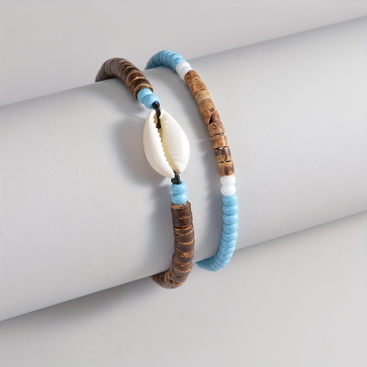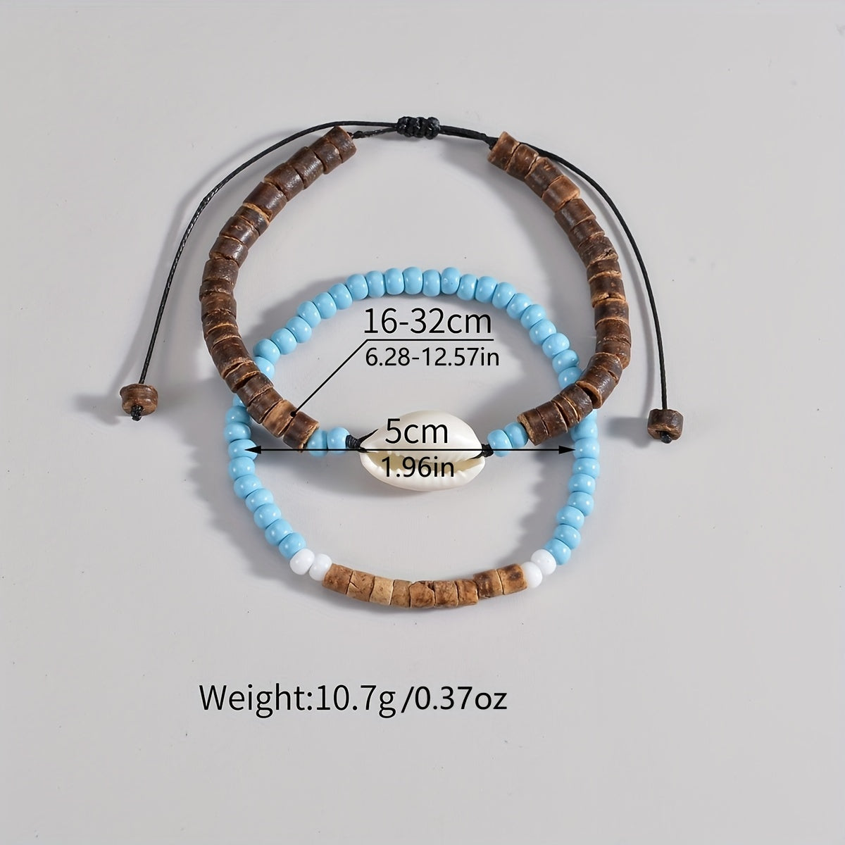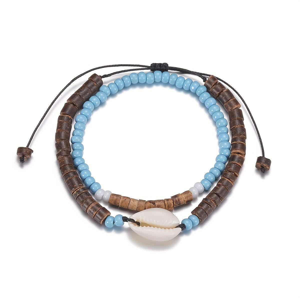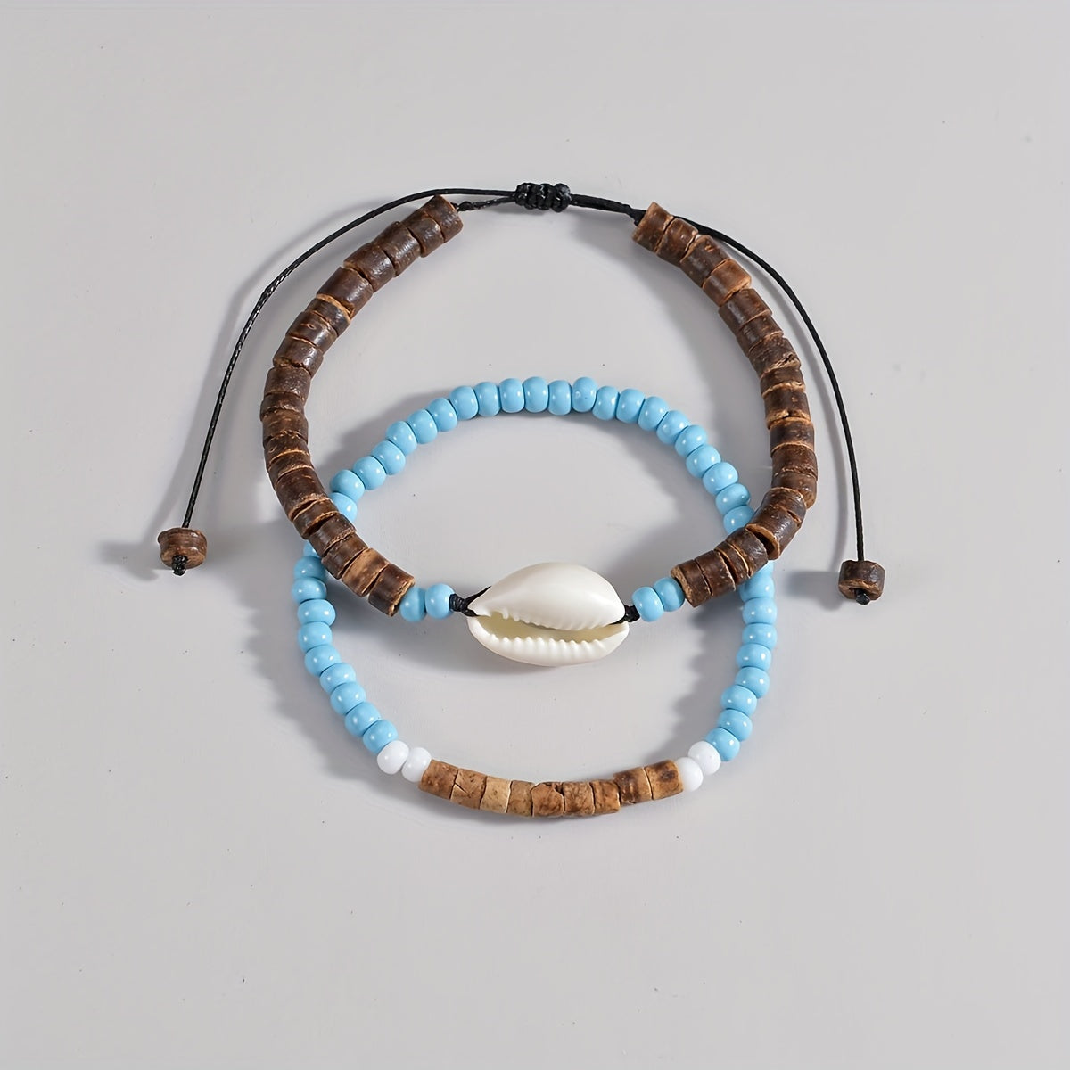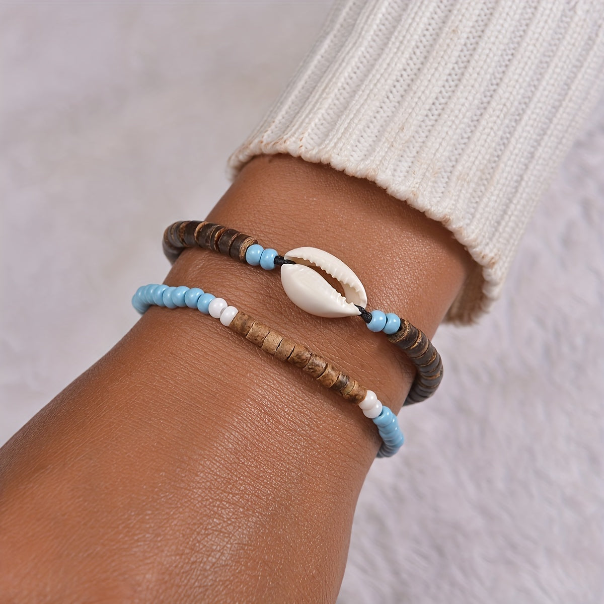 Elevate your style with this bohemian bracelet set featuring braided design, shell, and wooden beads. Perfect for women who love a trendy look.