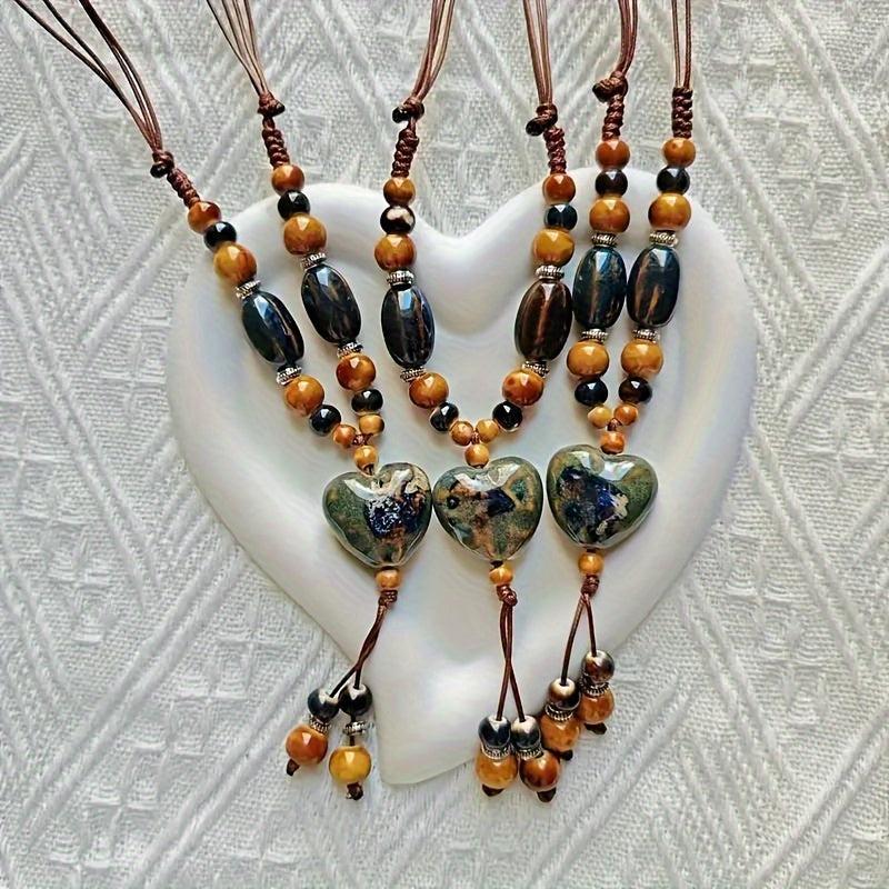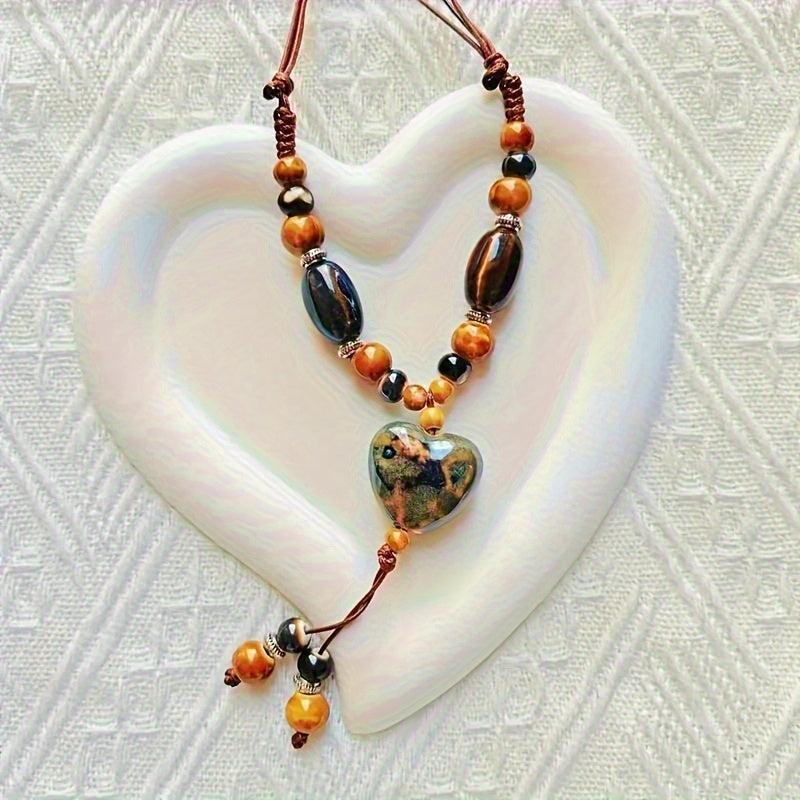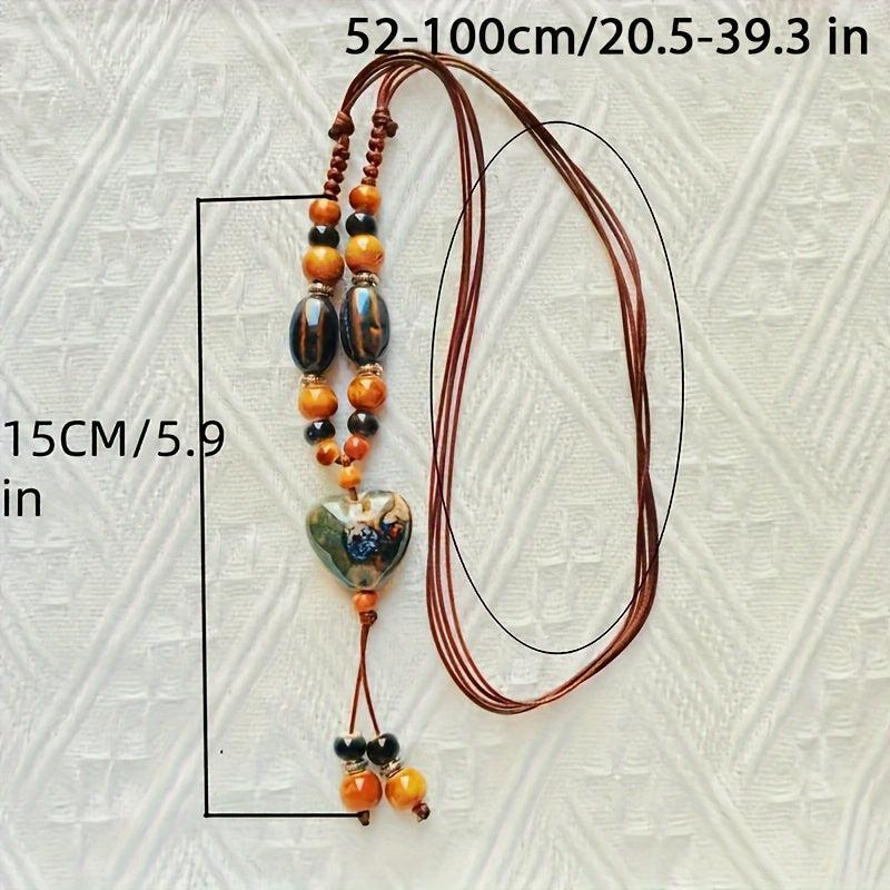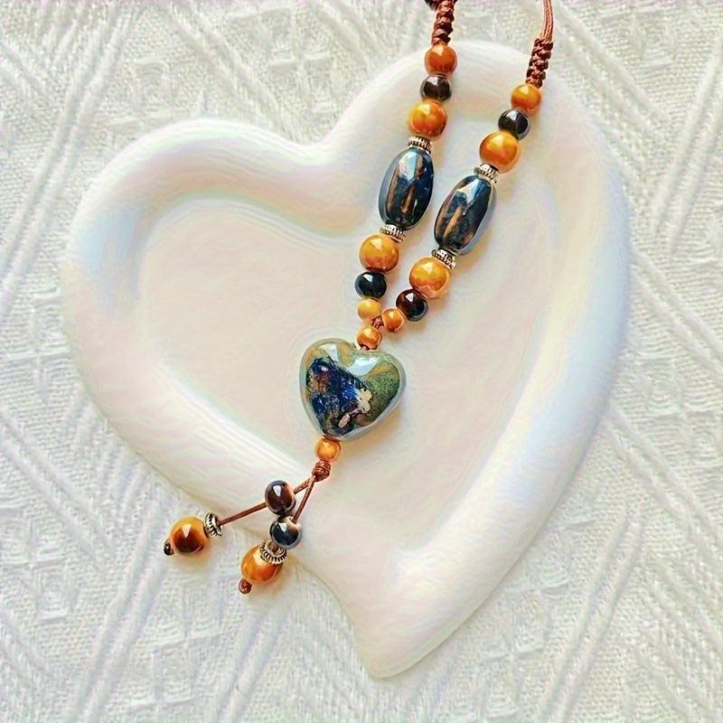 This handcrafted pendant necklace features a retro ceramic heart pendant with high temperature kiln fired glaze beads. The design is artisan made with no metal plating to ensure authenticity.