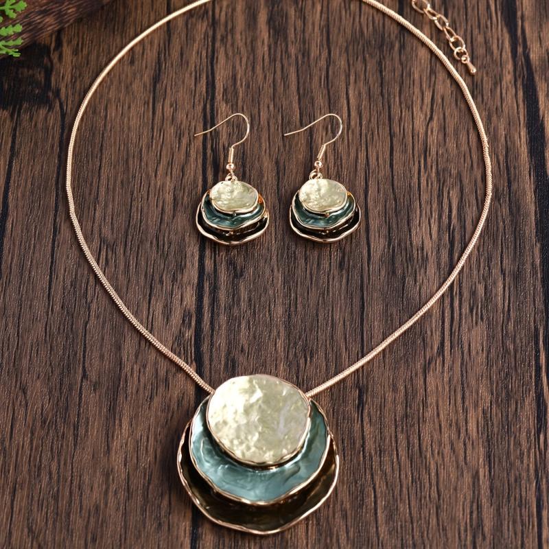 Elegant and stylish, this three-layer circular necklace and earrings set is perfect for holiday parties and special occasions. Made of high-quality zinc alloy with golden enamel finish, this set is a great gift for girlfriends and loved ones.