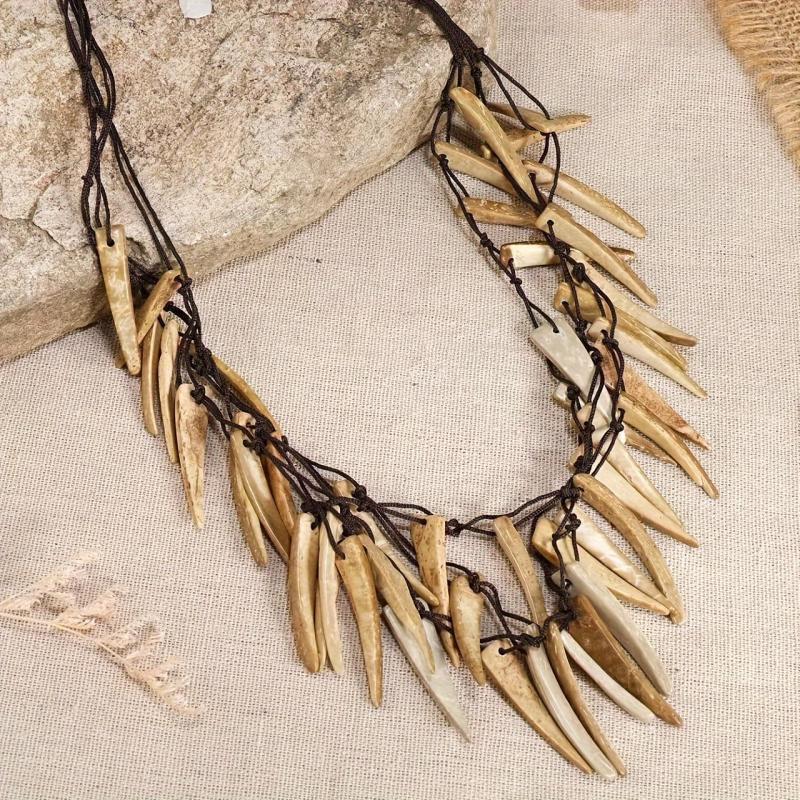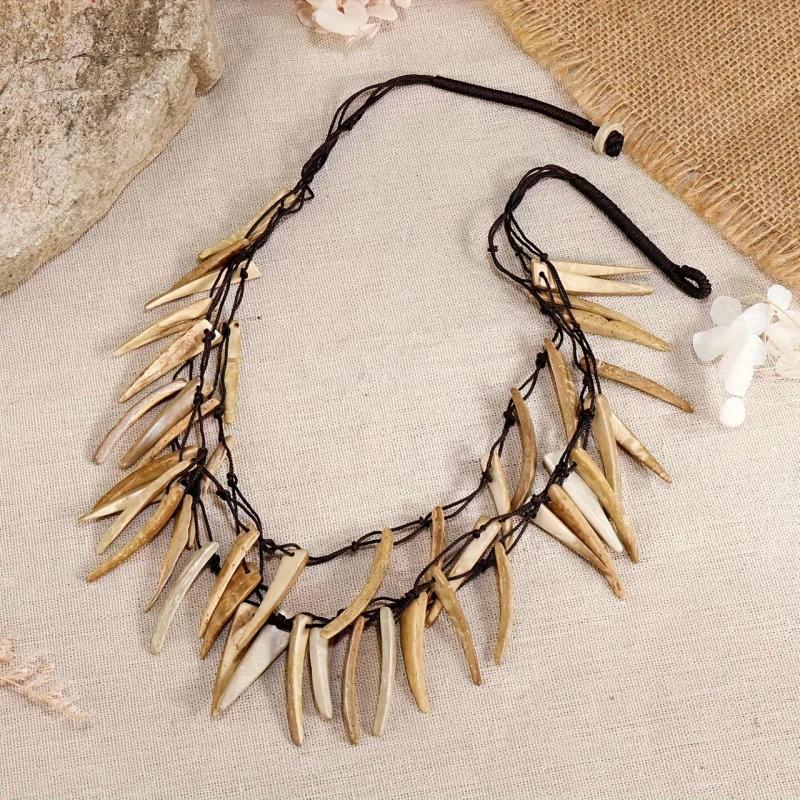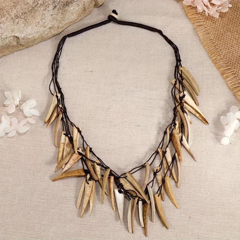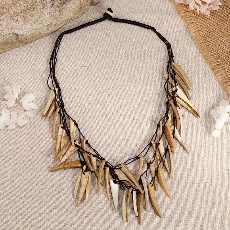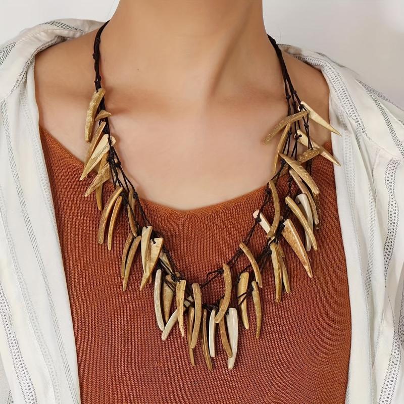 Embrace rustic natural textures with this unique coconut shell necklace adorned with recycled wood beads. Perfect for bohemian style lovers.