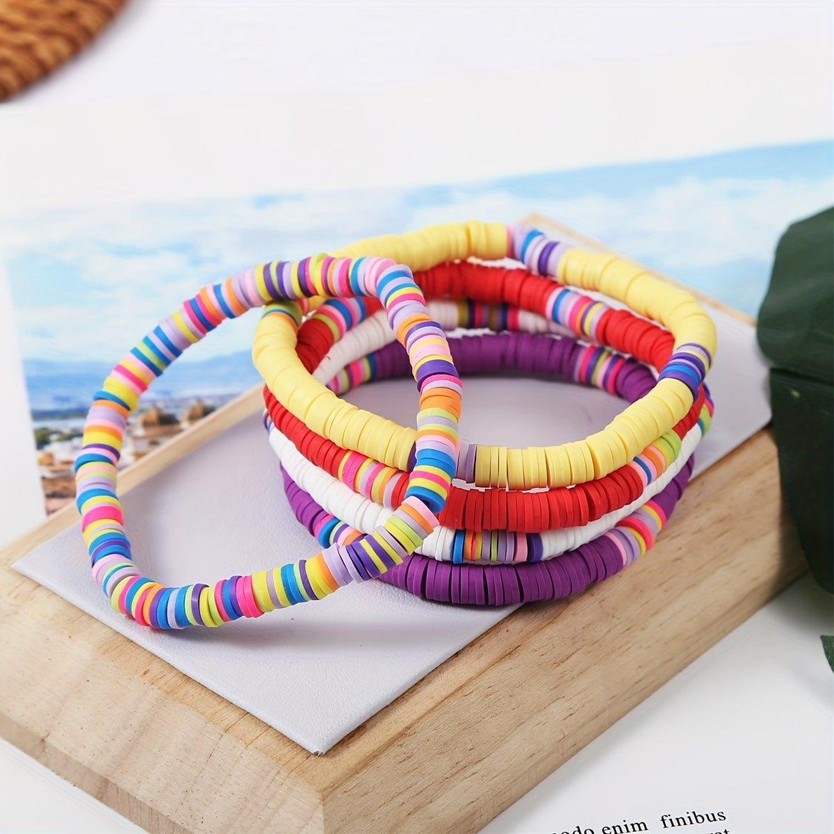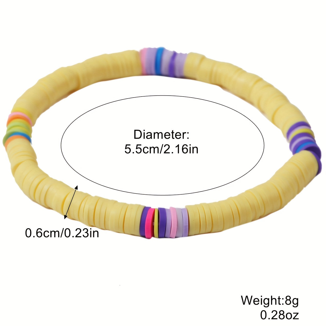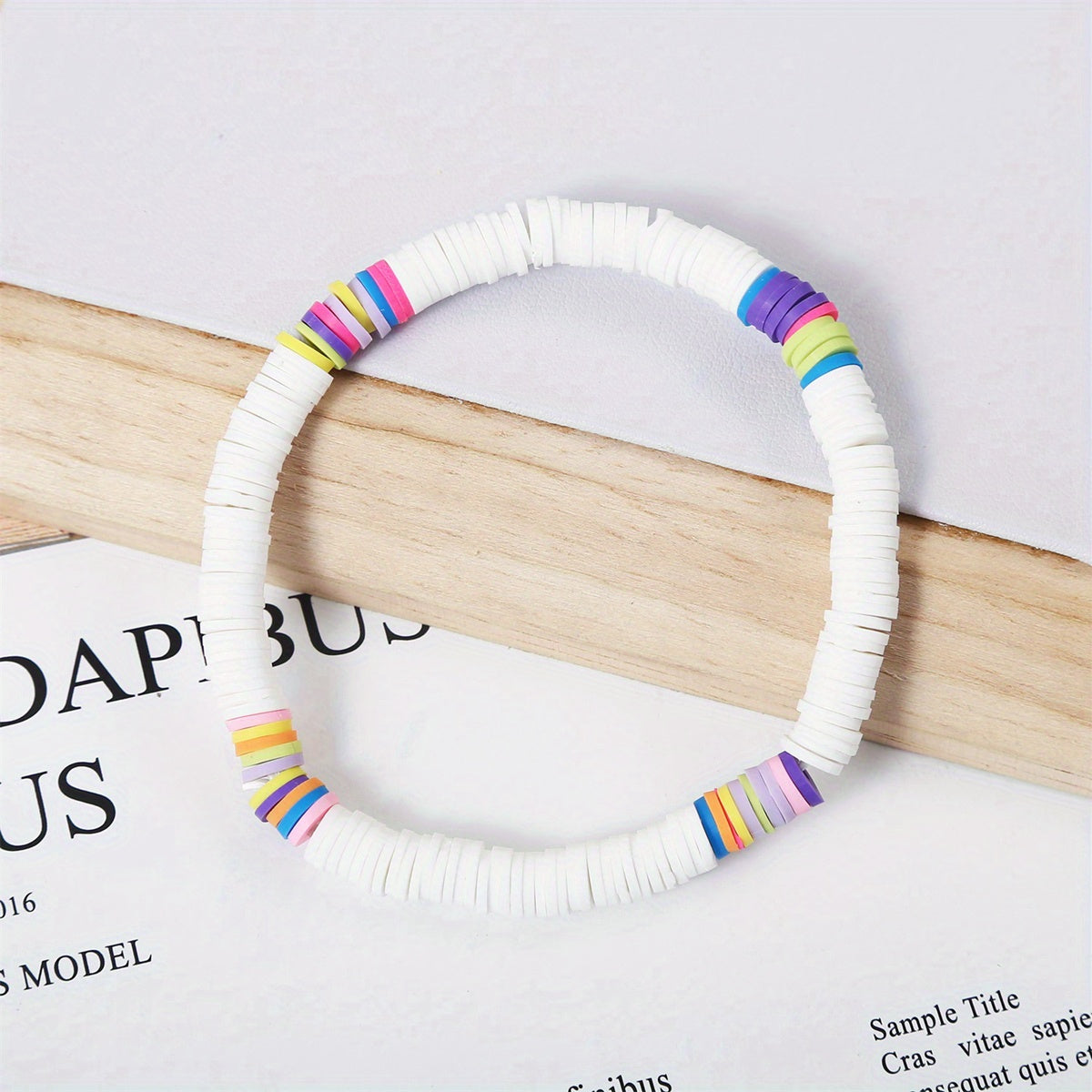 Add a touch of bohemian flair to your summer beach look with this colorful soft clay bracelet. Perfect for travel or everyday wear.