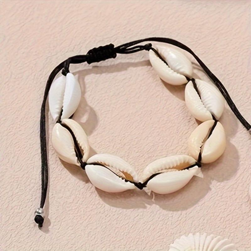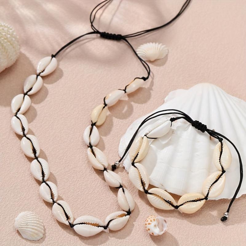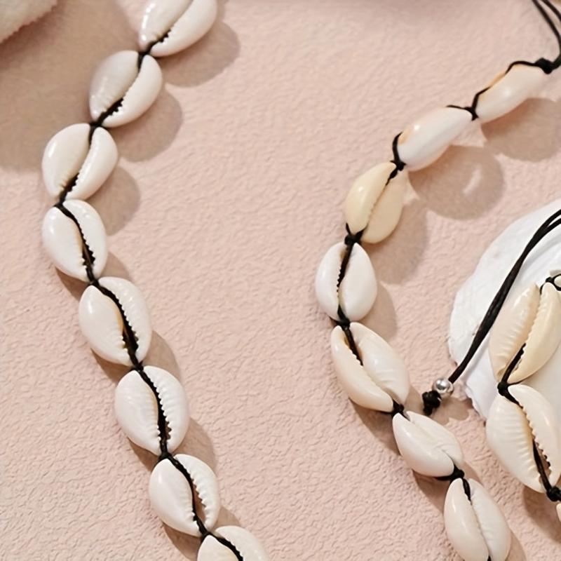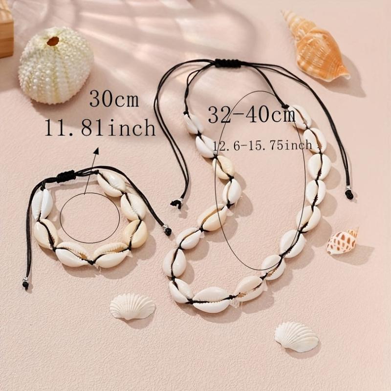 Elevate your beach vacation look with this bohemian style set featuring natural cowrie shells. The adjustable polyester rope ensures a comfortable fit.
