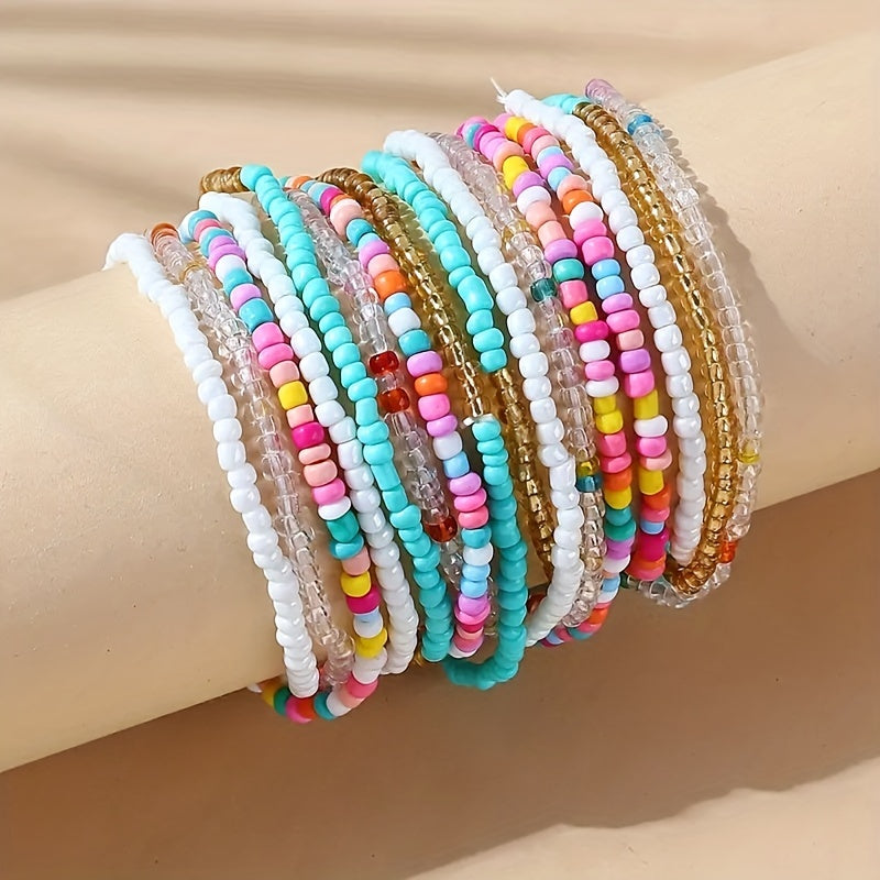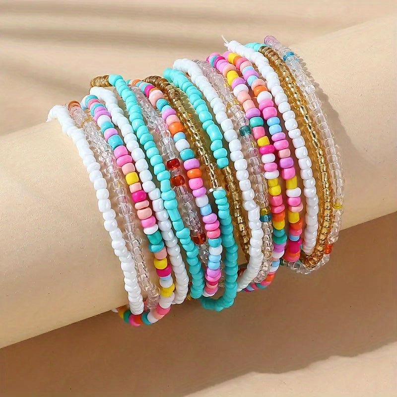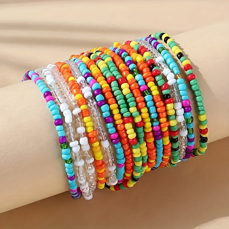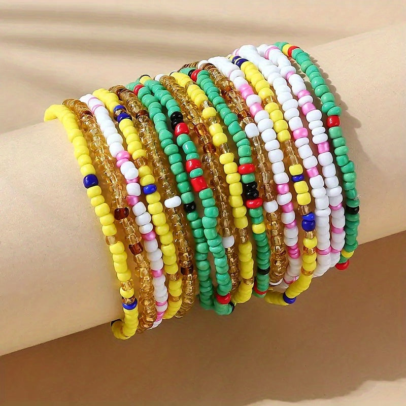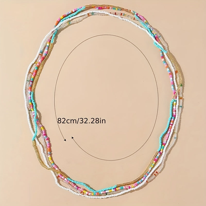 This Bohemian-style bracelet combination can be worn as a waist chain or ankle chain. Features long beads and elastic design for comfortable fit.