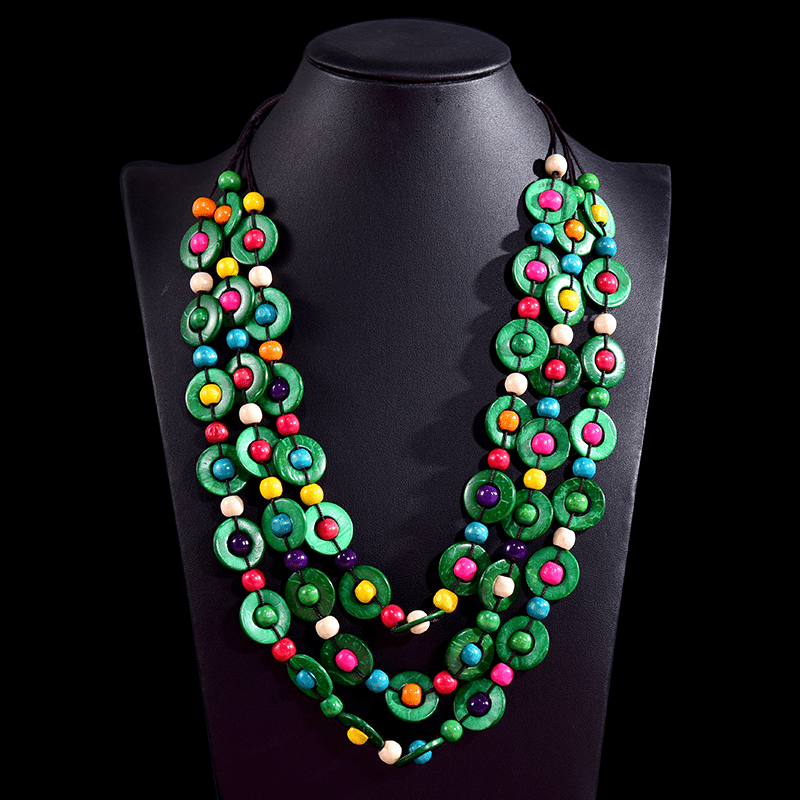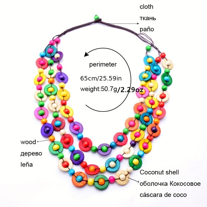 Add a touch of bohemian flair to your outfit with this multilayer wooden beads pendant necklace. The necklace features coconut shell and multicolor beads for a vibrant look.