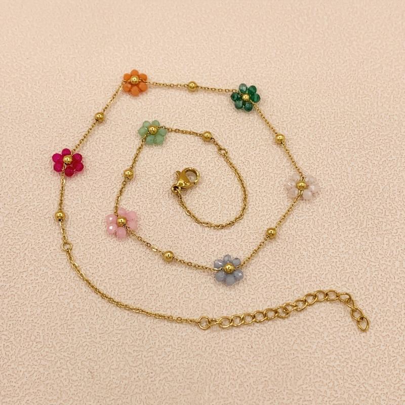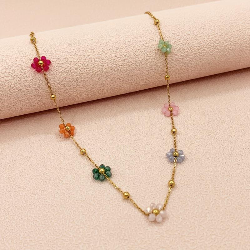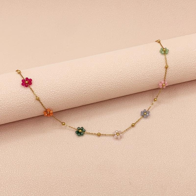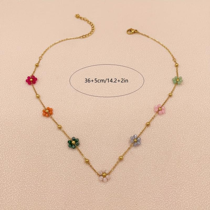This Bohemian flower necklace features a colorful beaded synthetic stone pendant on a golden tone chain. Perfect for weddings, parties, or casual attire with a bohemian flair.