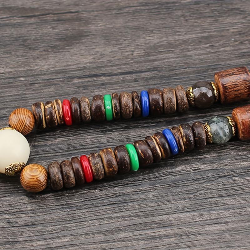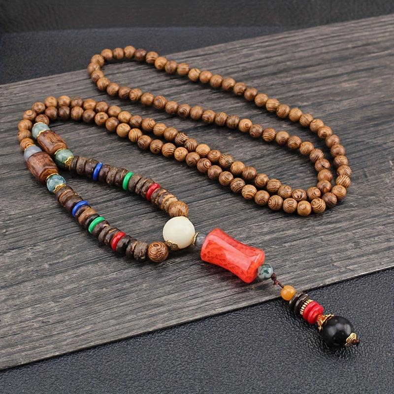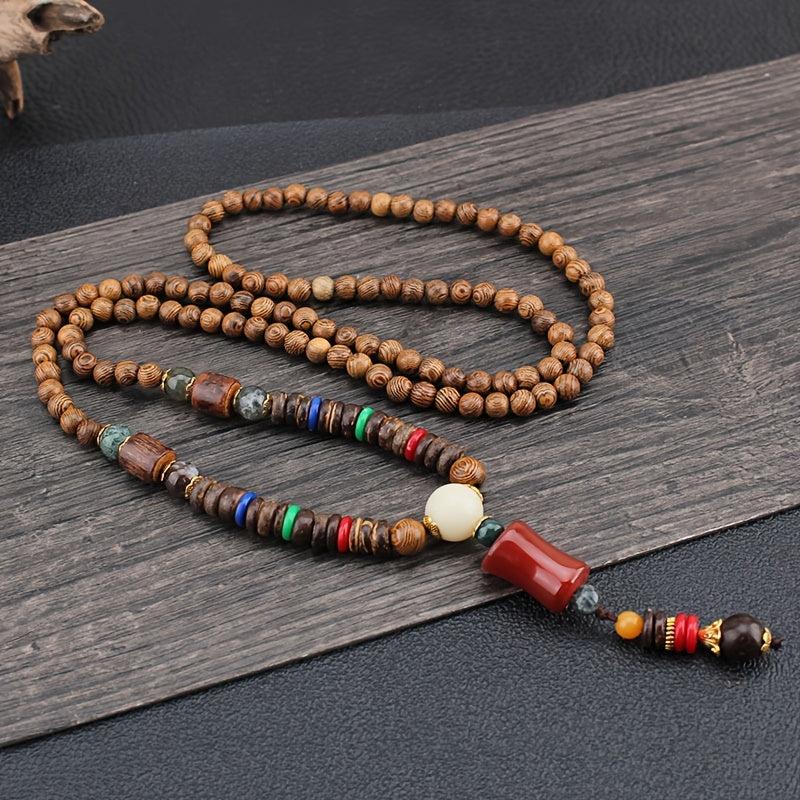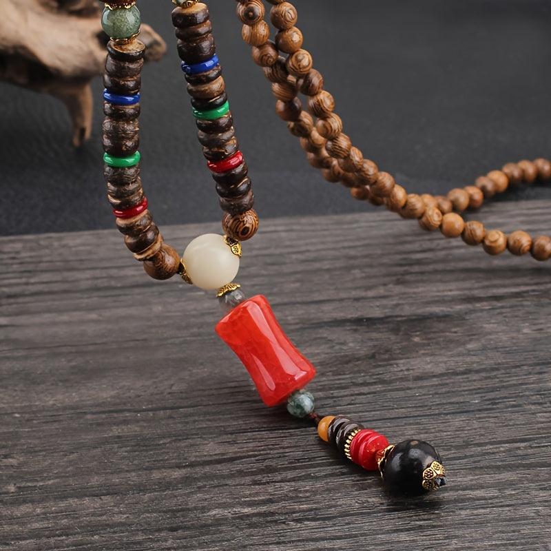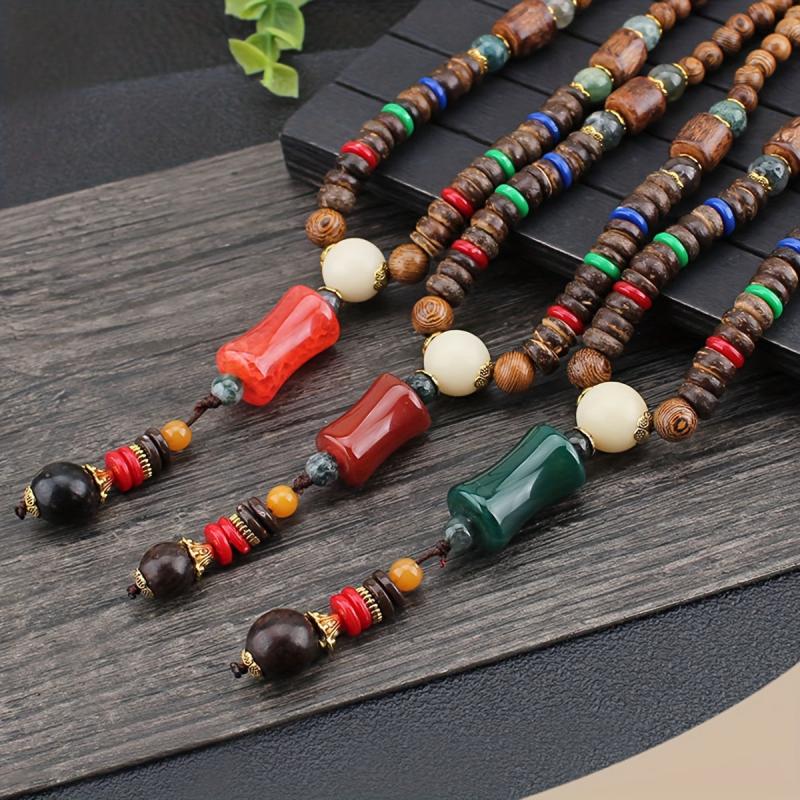 Unique bohemian glass bead necklace featuring a wooden pendant with multicolor glass beads in earthy tones and golden accents. Perfect for men and women looking for a cultural ethnic style accessory.