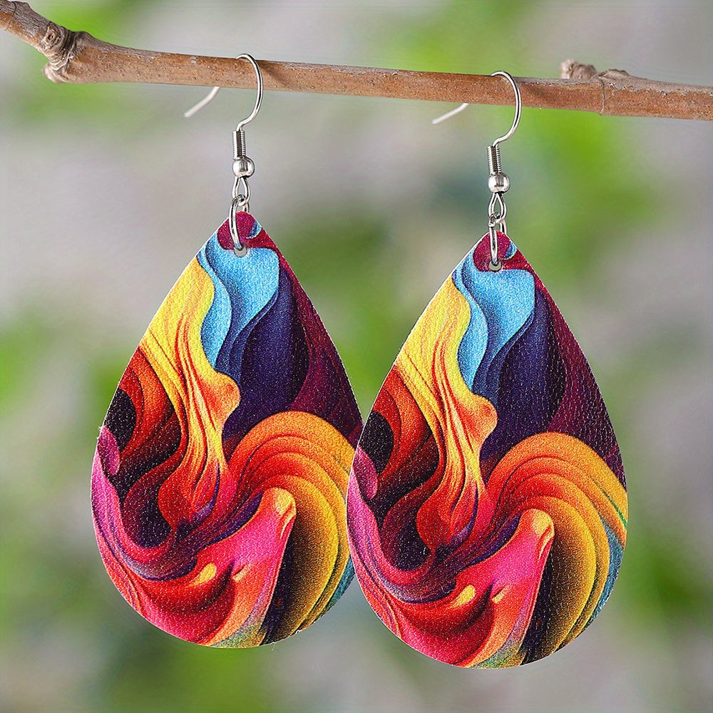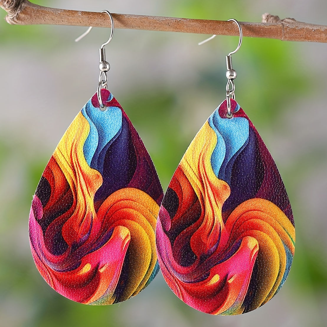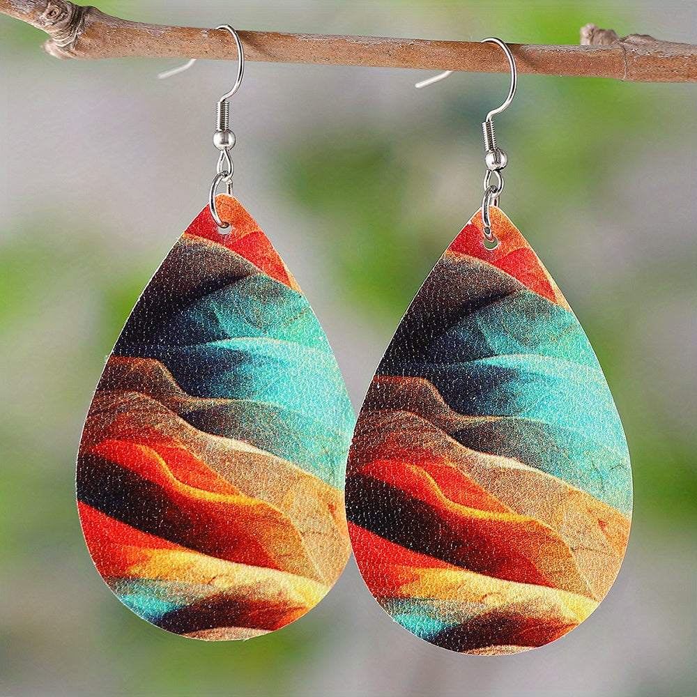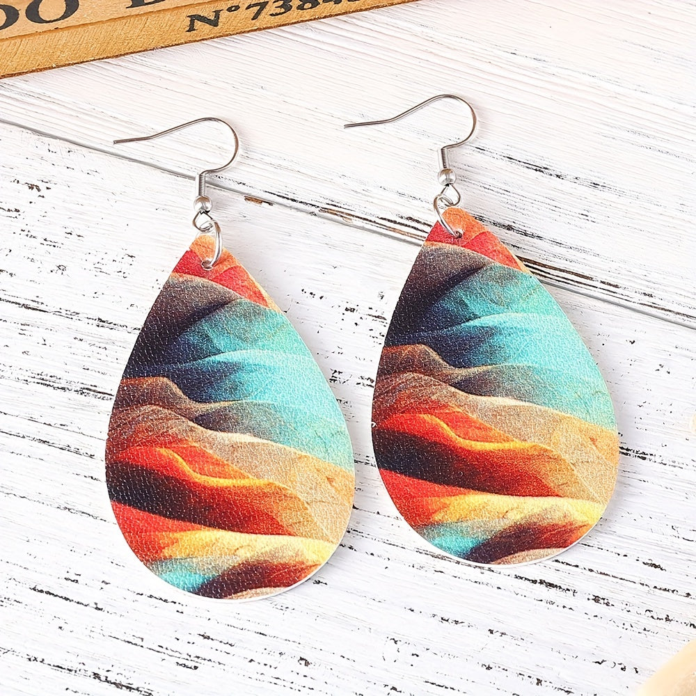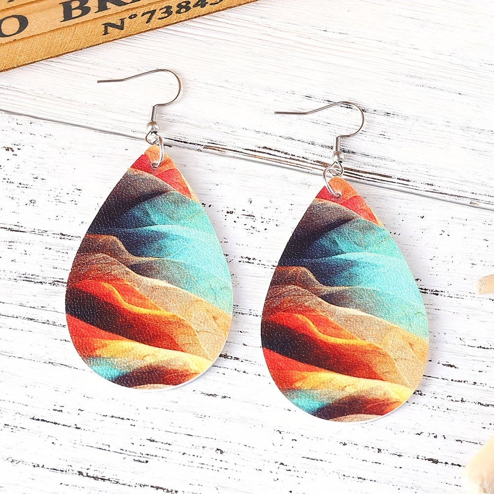 These vintage-inspired dangle earrings feature a colorful gradient pattern and double-sided print. Made of PU leather, they are a creative and unique accessory that makes a great gift for women.