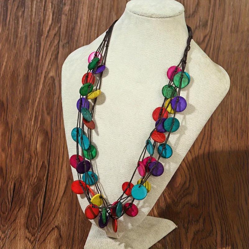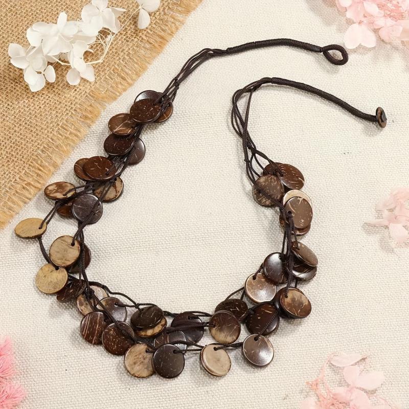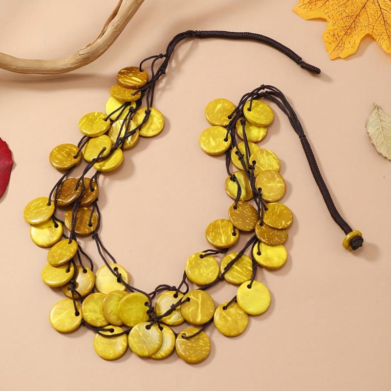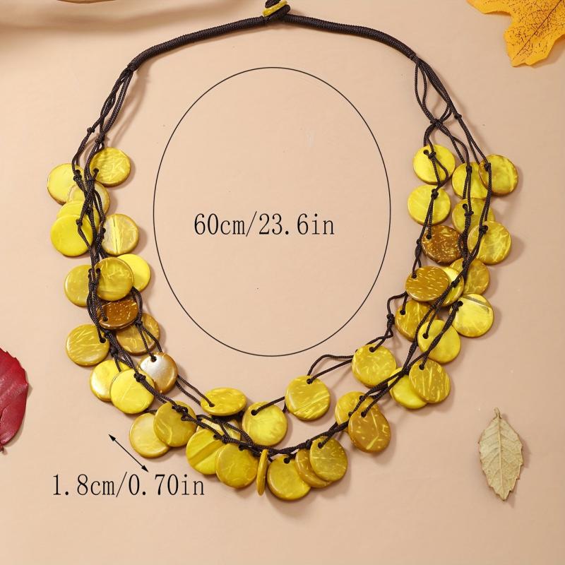 Elevate your casual attire with this Bohemian layer necklace featuring high recycled wood beads in golden yellow and accents on an adjustable brown cord. A perfect gift idea!