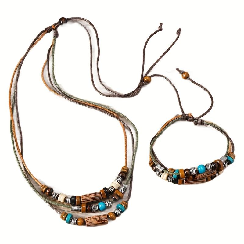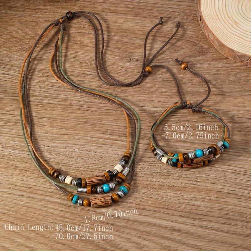 This retro bohemian necklace and bracelet set features a versatile and trendy design. The layer wooden beads create a unique and stylish look, perfect for any outfit.