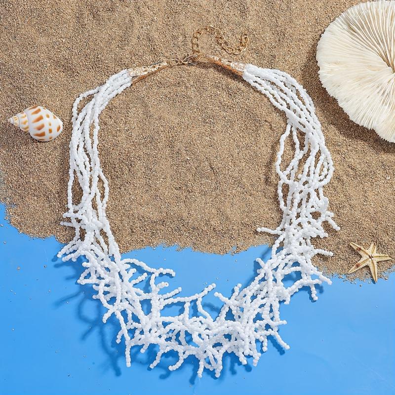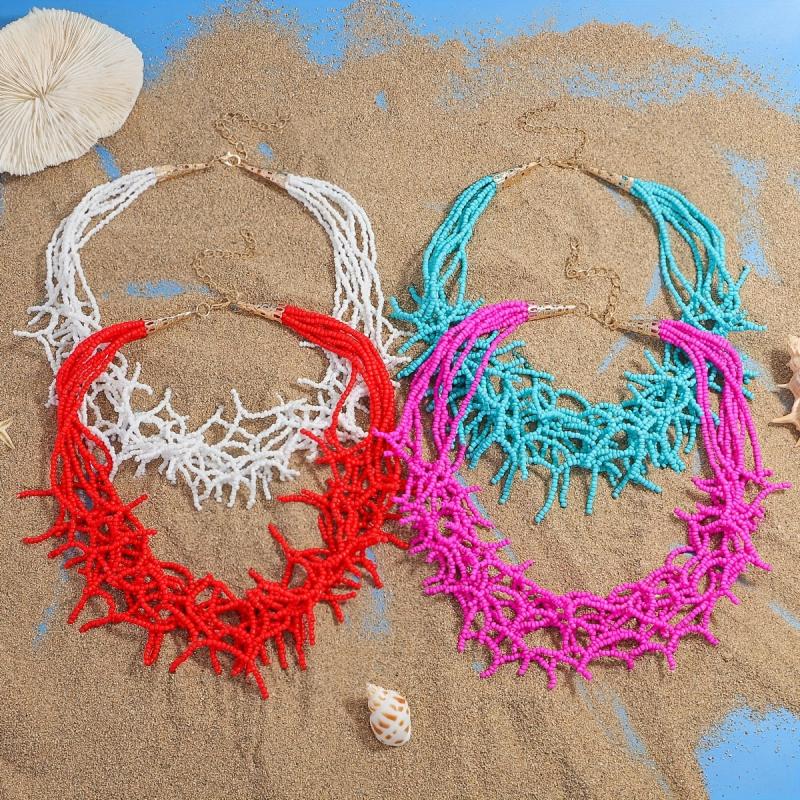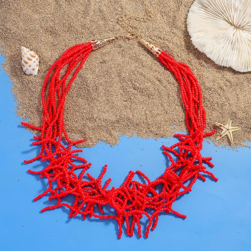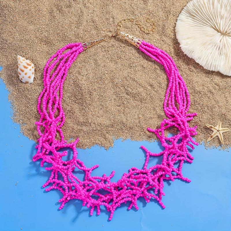 Add a pop of color to your outfit with this vibrant coral bead necklace. Made with lightweight plastic beads, this necklace is perfect for summer beach days or party wear.