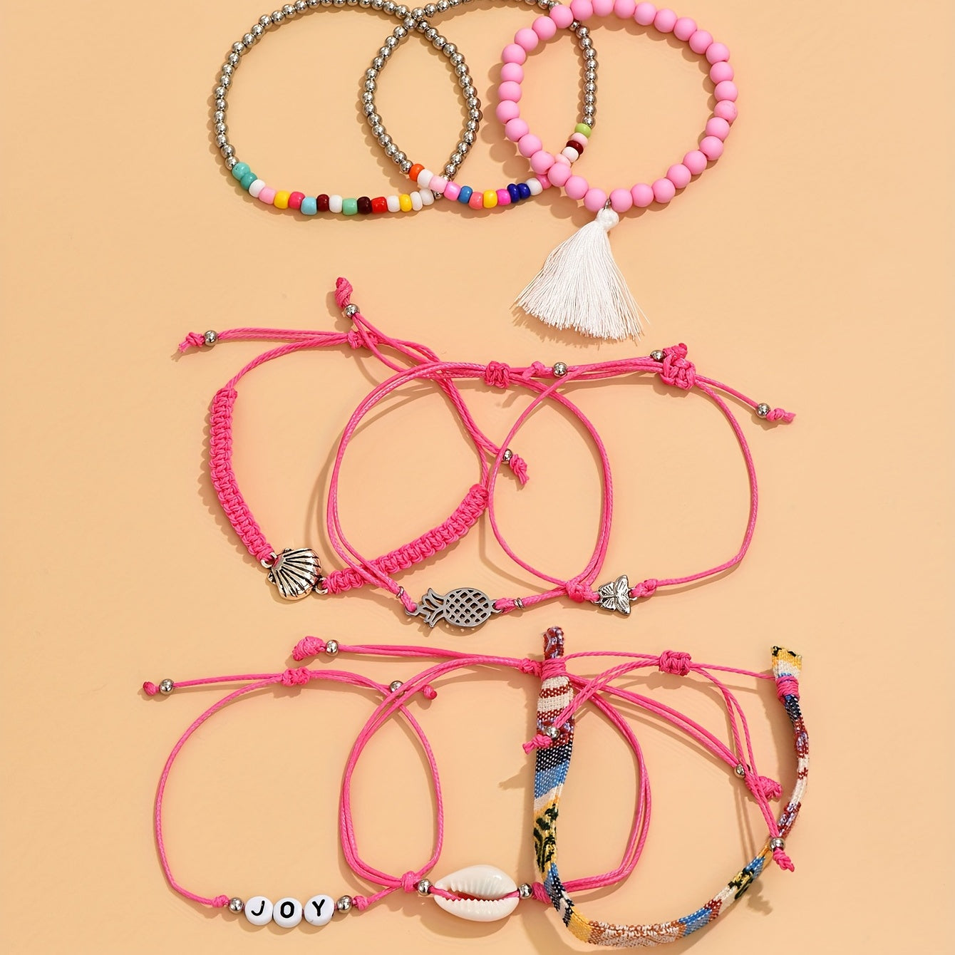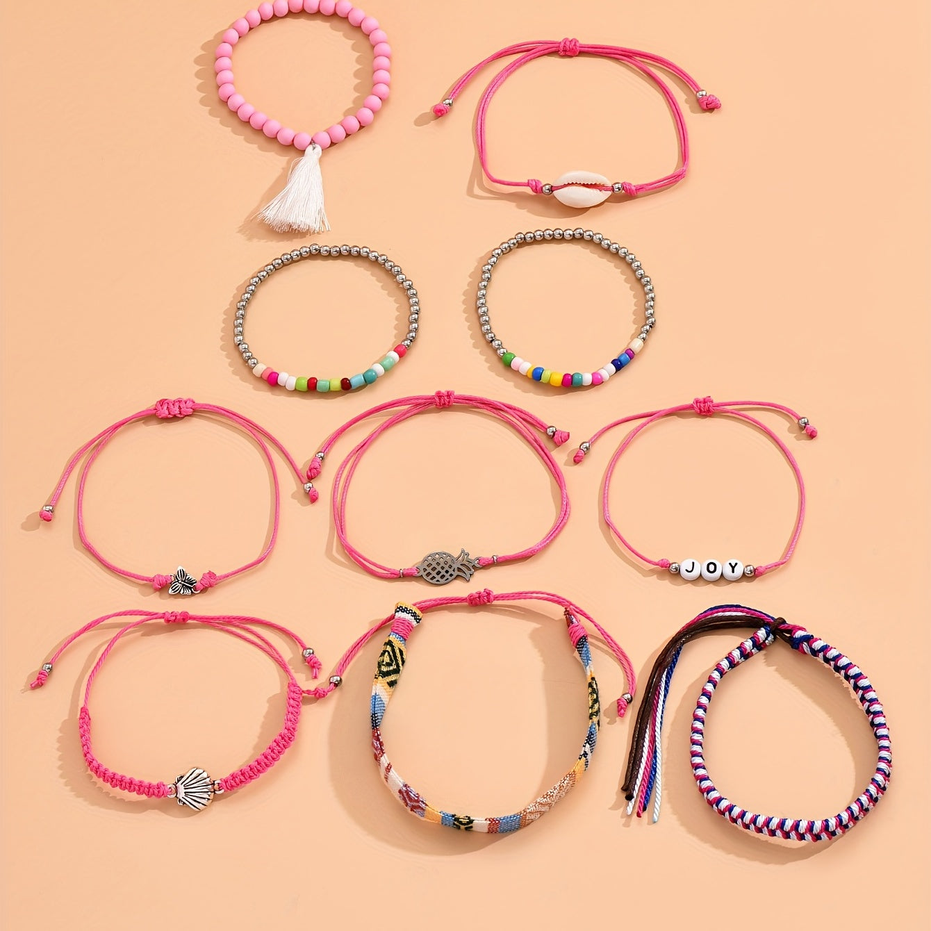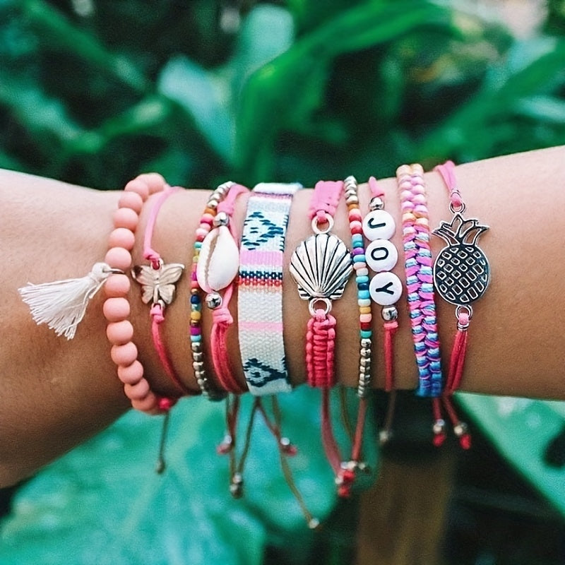 Express your holiday style with this 10-piece set of bohemian braided bracelets adorned with shell beads. The creative pink design adds a touch of elegance to your look.