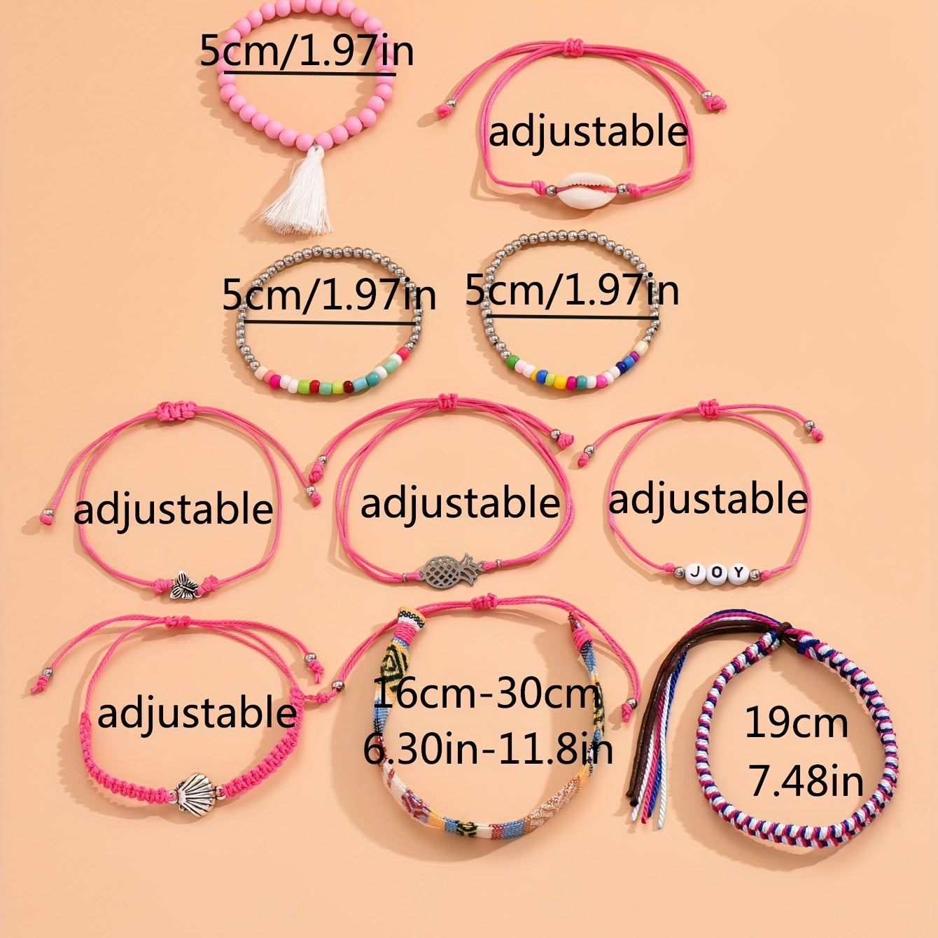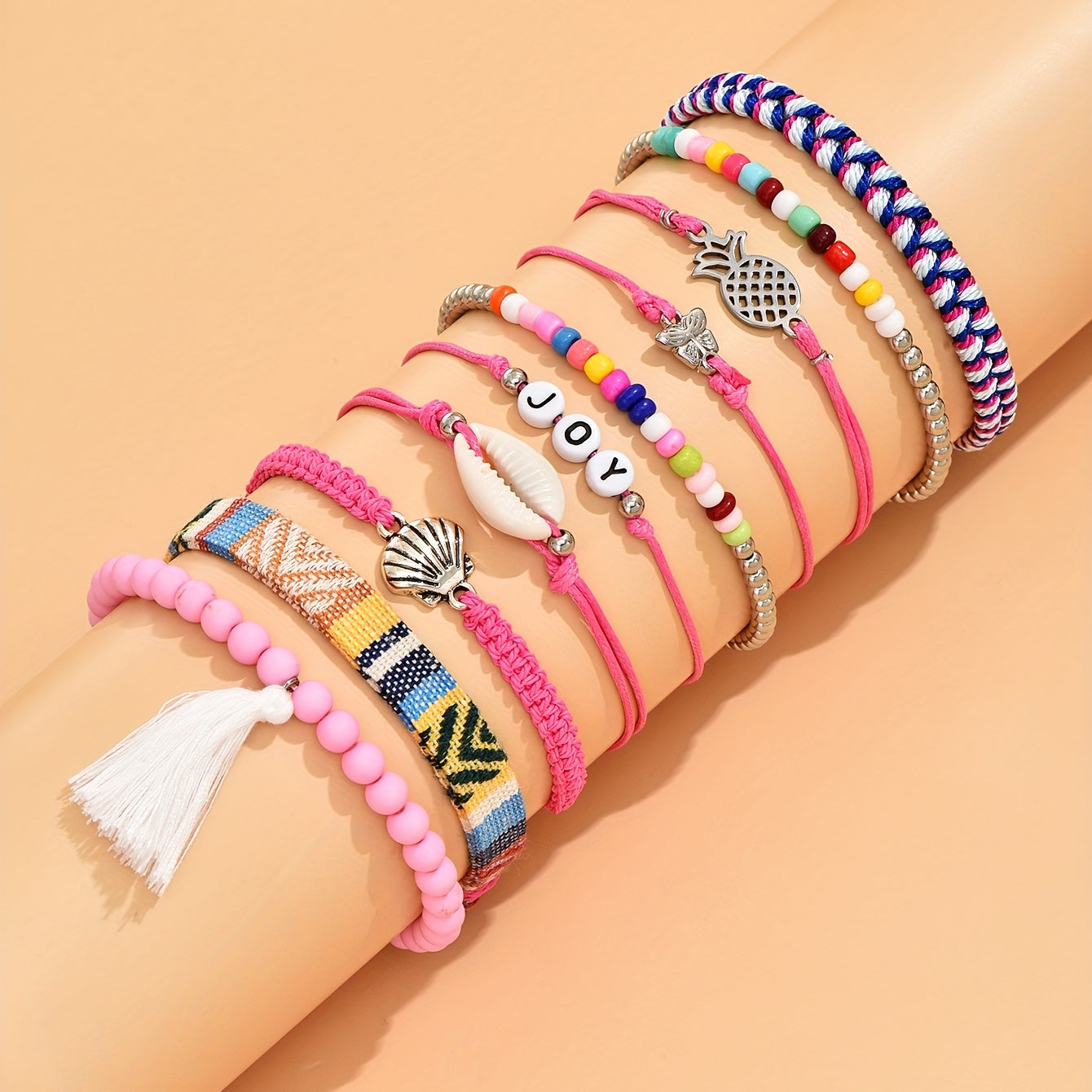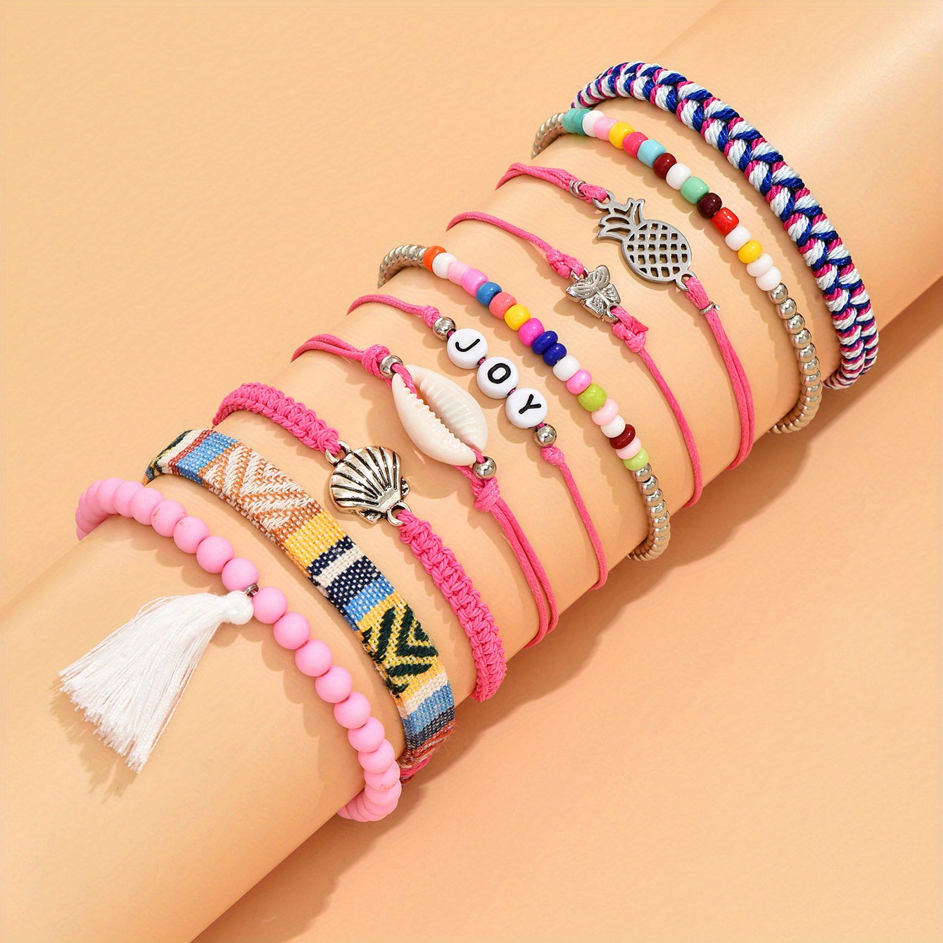 Express your holiday style with this 10-piece set of bohemian braided bracelets adorned with shell beads. The creative pink design adds a touch of elegance to your look.