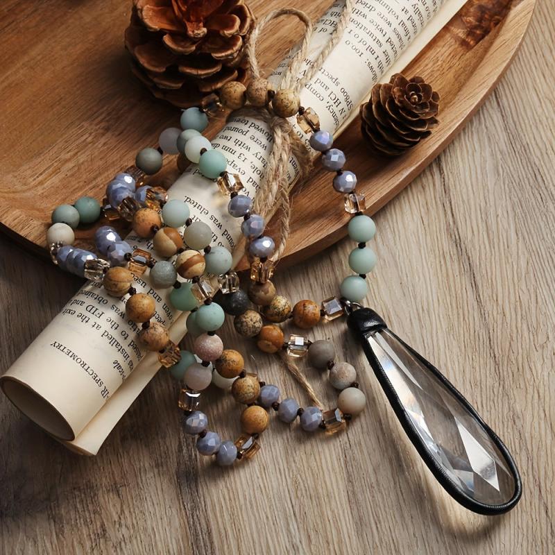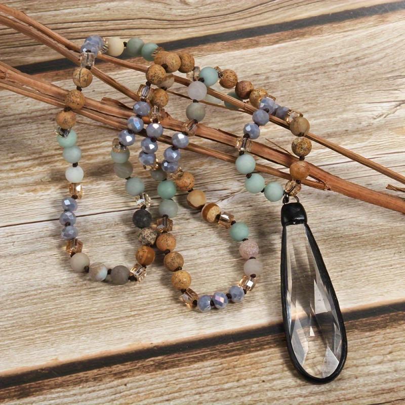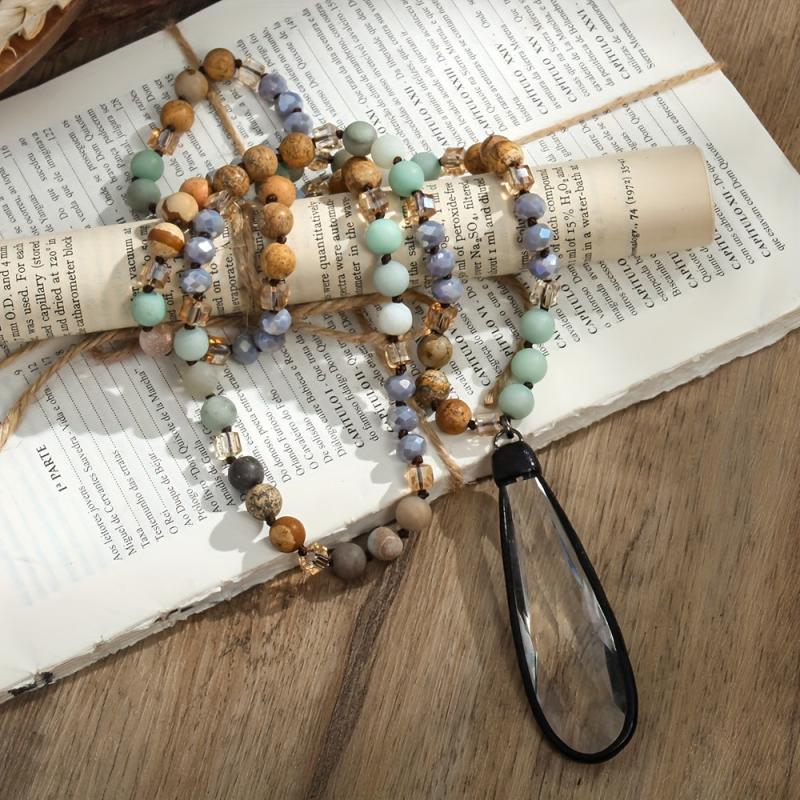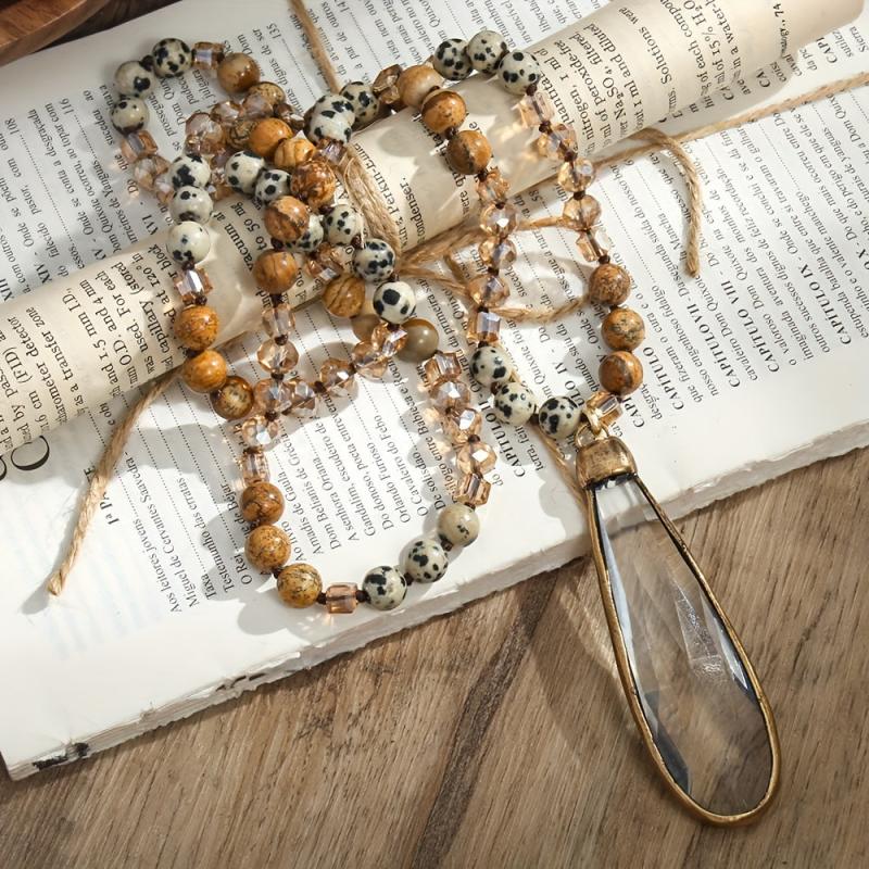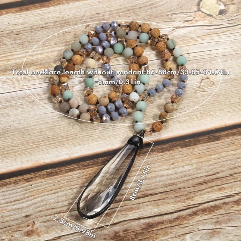 Elevate your look with this Bohemian Natural Stone & Glass Drop Pendant Necklace featuring a knot design with beads. Perfect for women to wear as a statement piece for daily wear or as an everyday accessory.