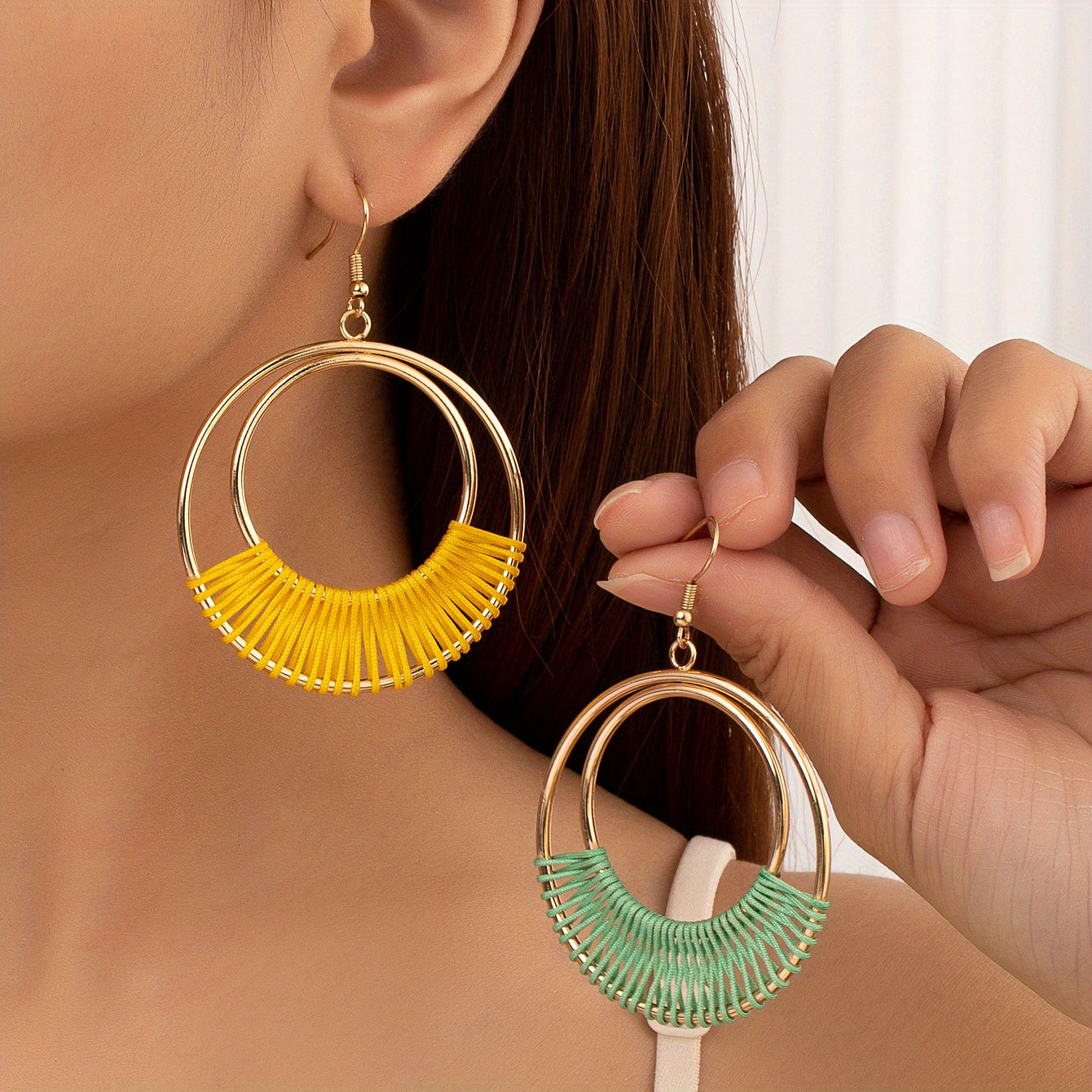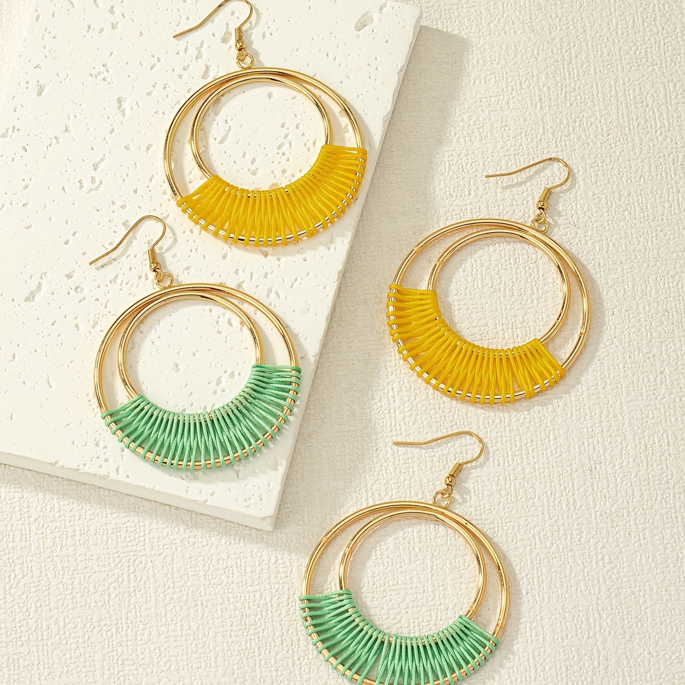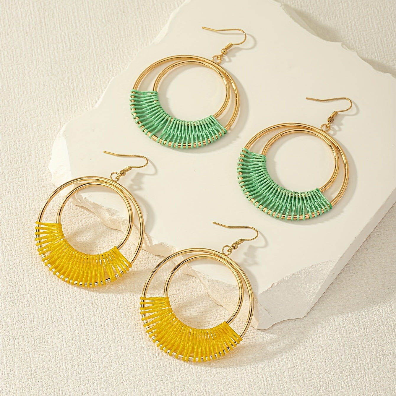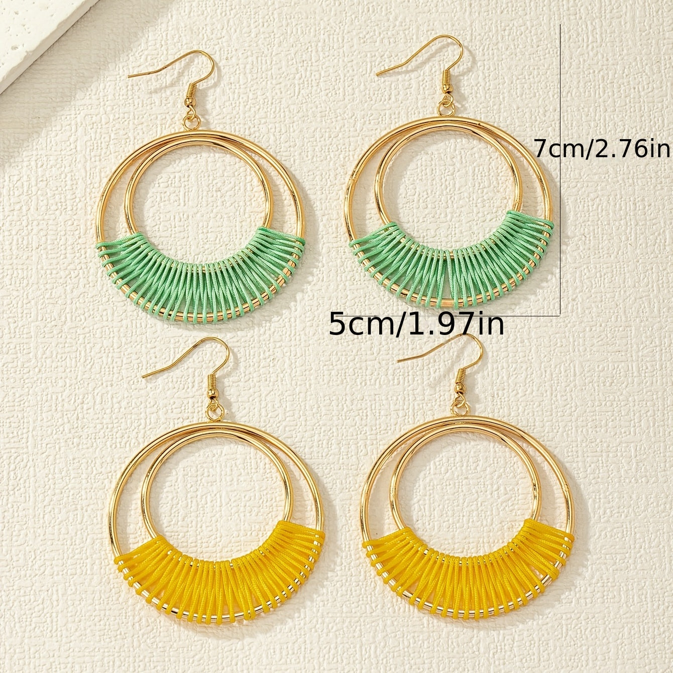 This set includes 2 pairs of double hollow circle earrings with threads wrapped, perfect for a bohemian style look. Ideal as a gift for women.