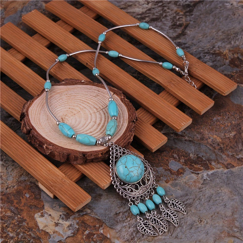 Bohemian Style Turquoise Pendant Necklace Leaf Tassel Women Party Jewelry