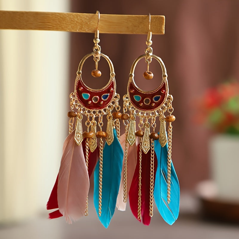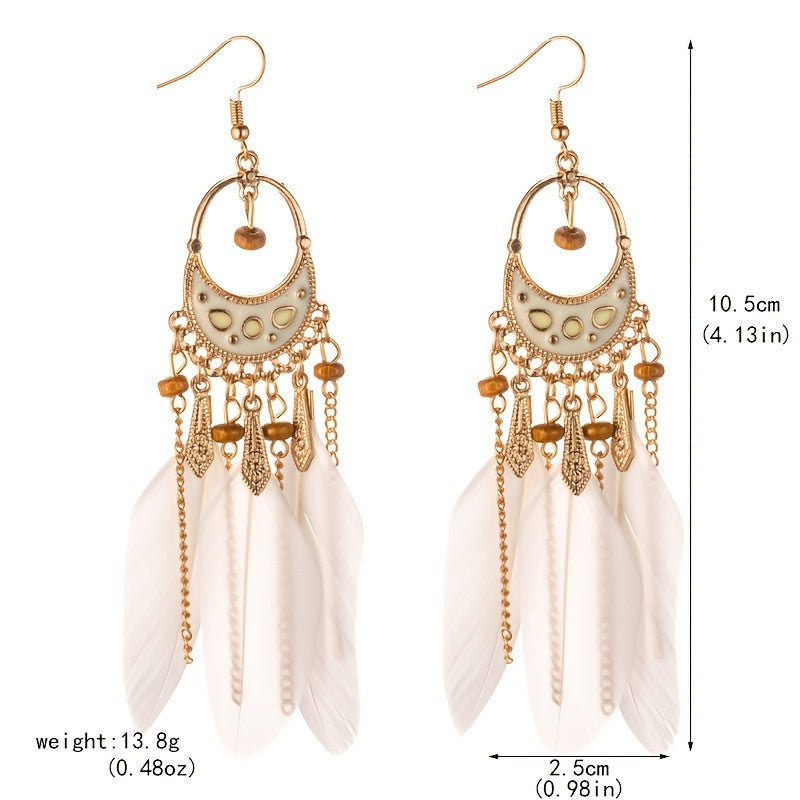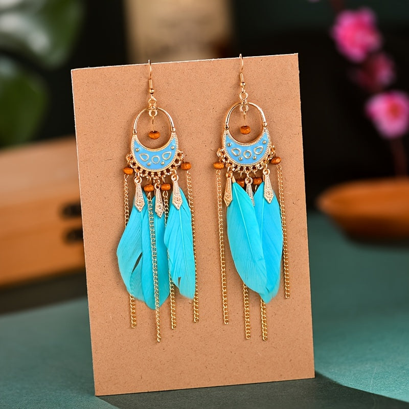 Add a touch of bohemian flair to your look with these long tassel feather earrings. Perfect accessory for any occasion.