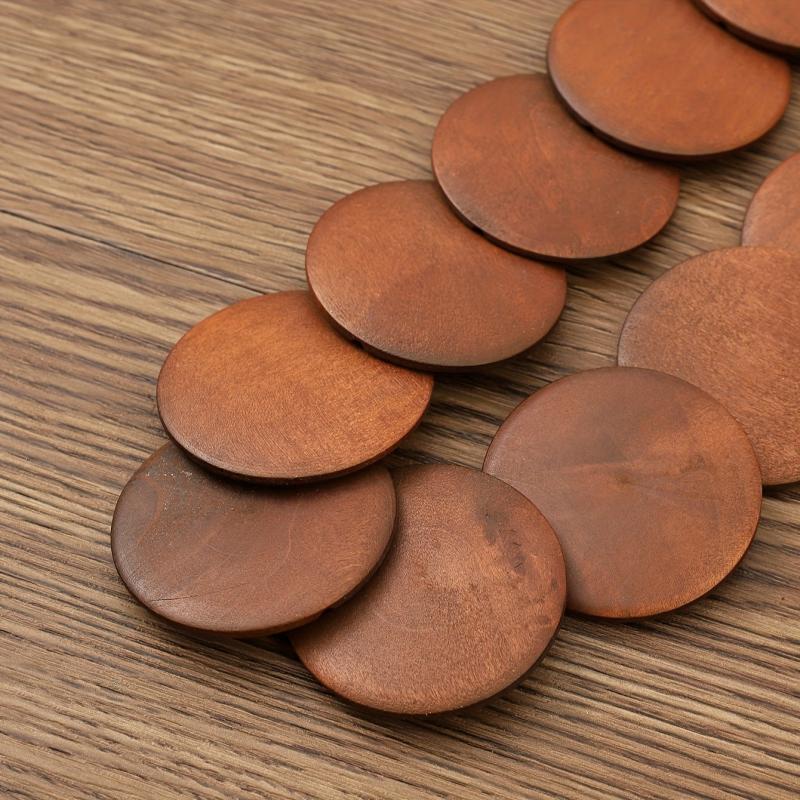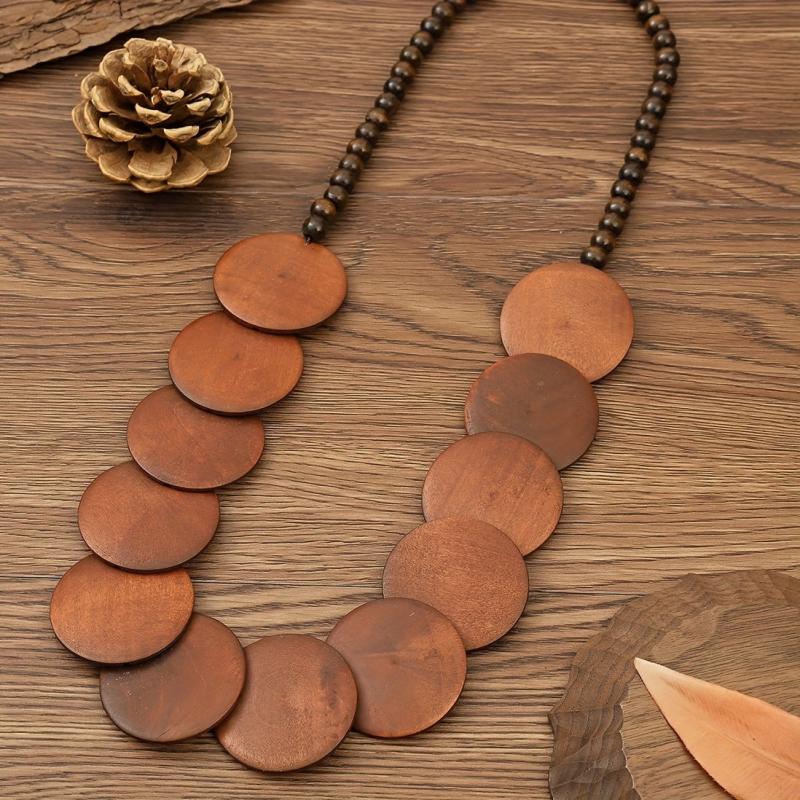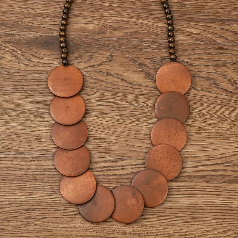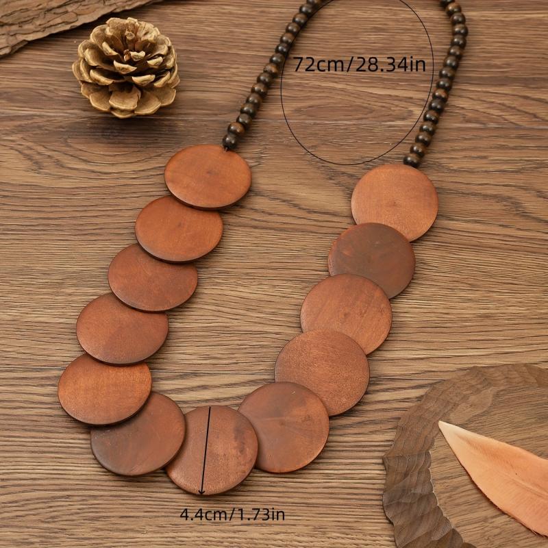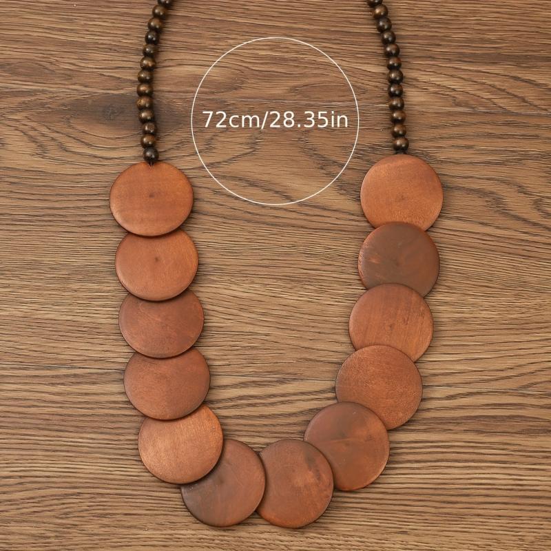 This bohemian vintage necklace features recycled wood beads on a brown cord, creating earthy brown tones. It is a versatile accessory that can be worn every day. Makes a great gift for women who love wooden jewelry.