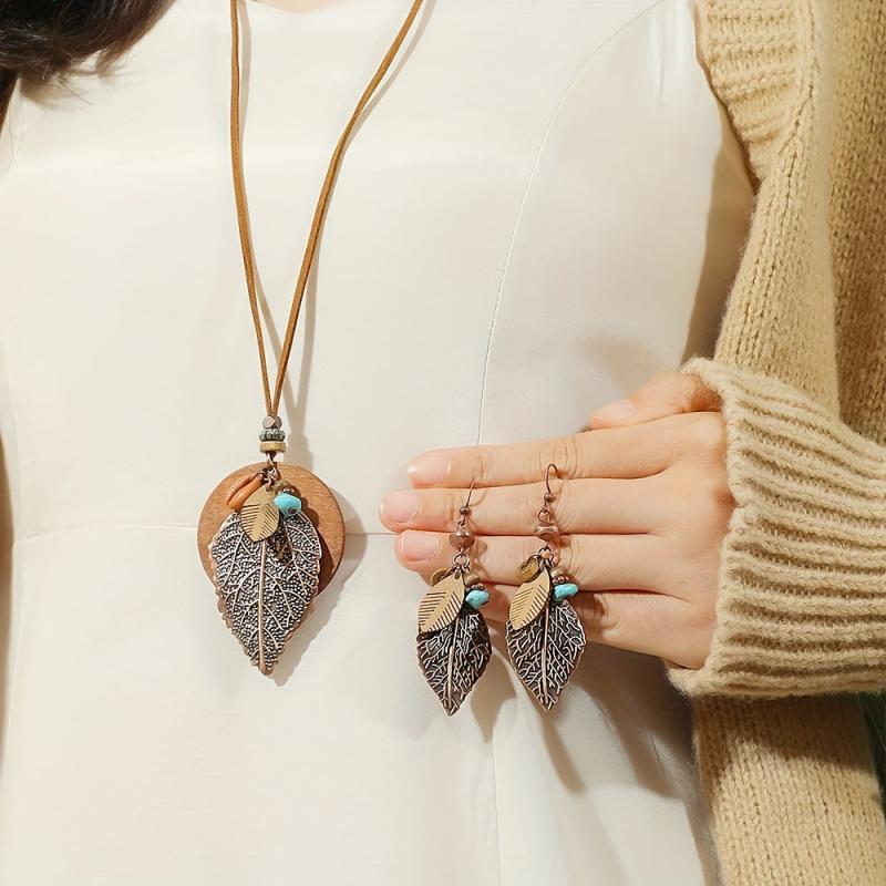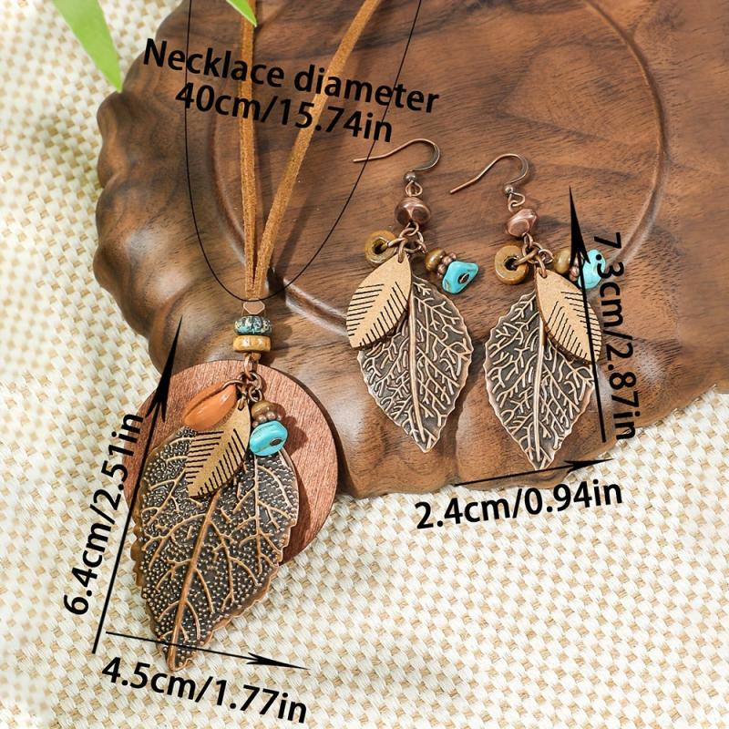 This bohemian vintage style jewelry set features a leaf pendant necklace with beaded wooden earrings. Perfect for adding a touch of nature-inspired charm to your outfit.