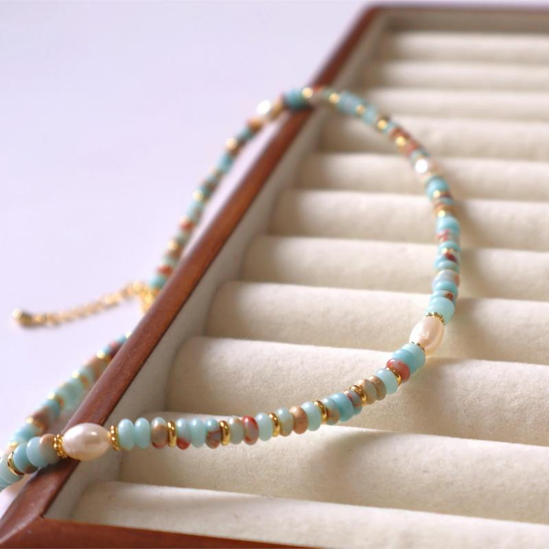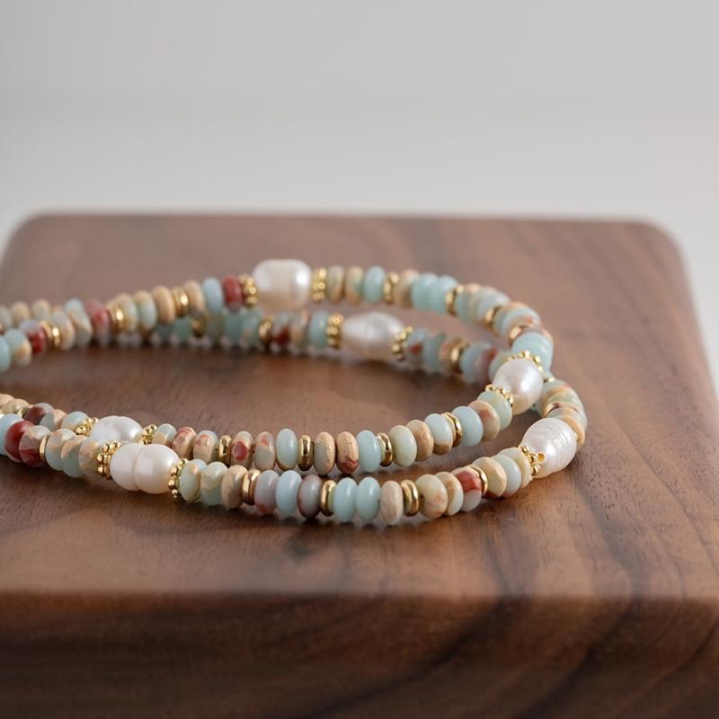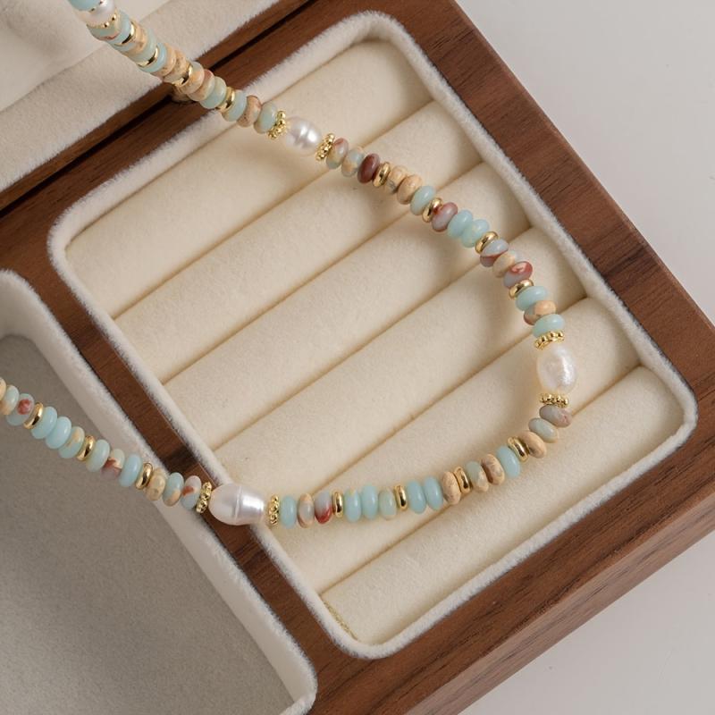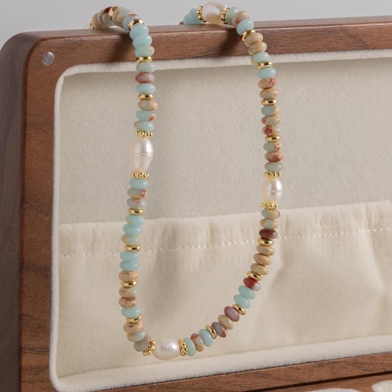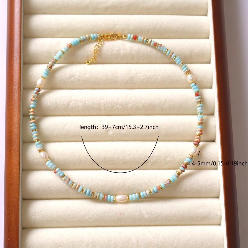 Elegant necklace featuring natural freshwater pearls and stone beads on a golden tone chain. Perfect for adding a touch of bohemian flair to any outfit. Makes a great gift for women on Valentine's Day.