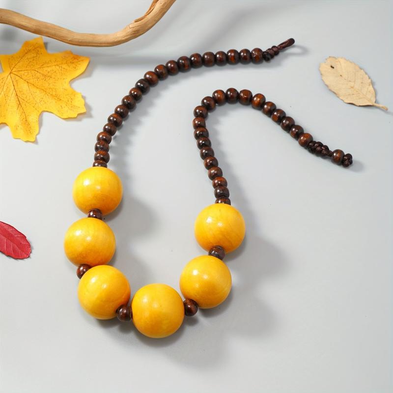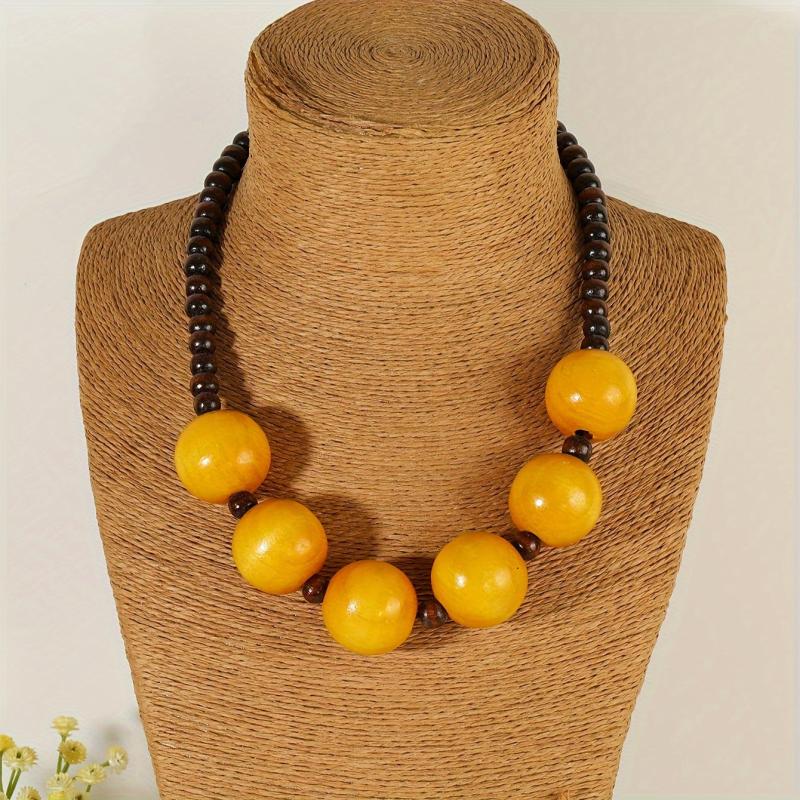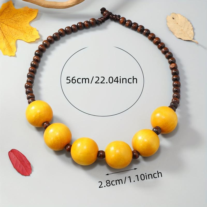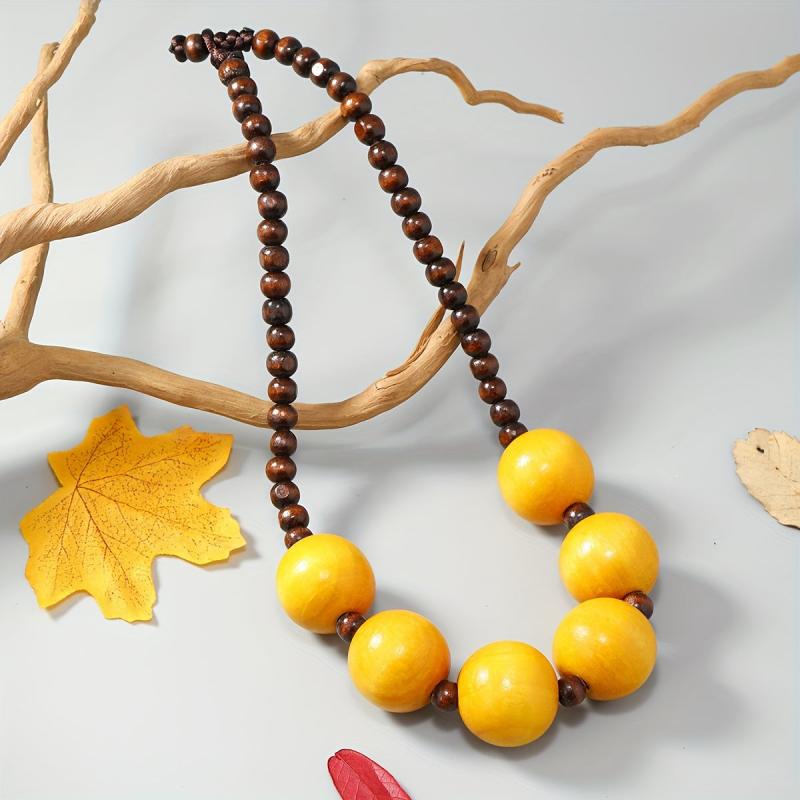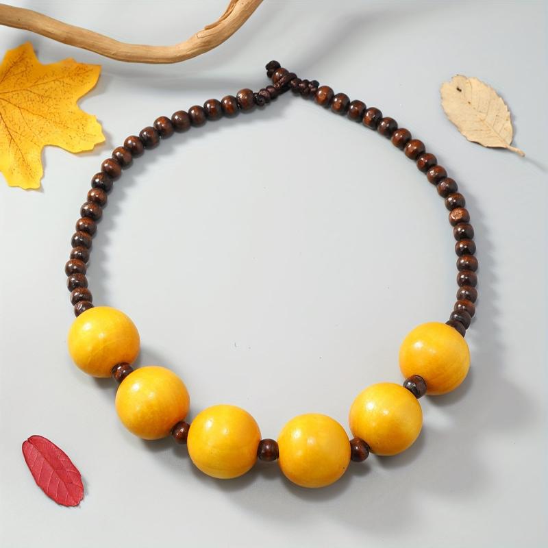 Add a touch of boho charm to your outfit with this recycled wood bead necklace featuring brown accents. Perfect for casual attire and gift giving.