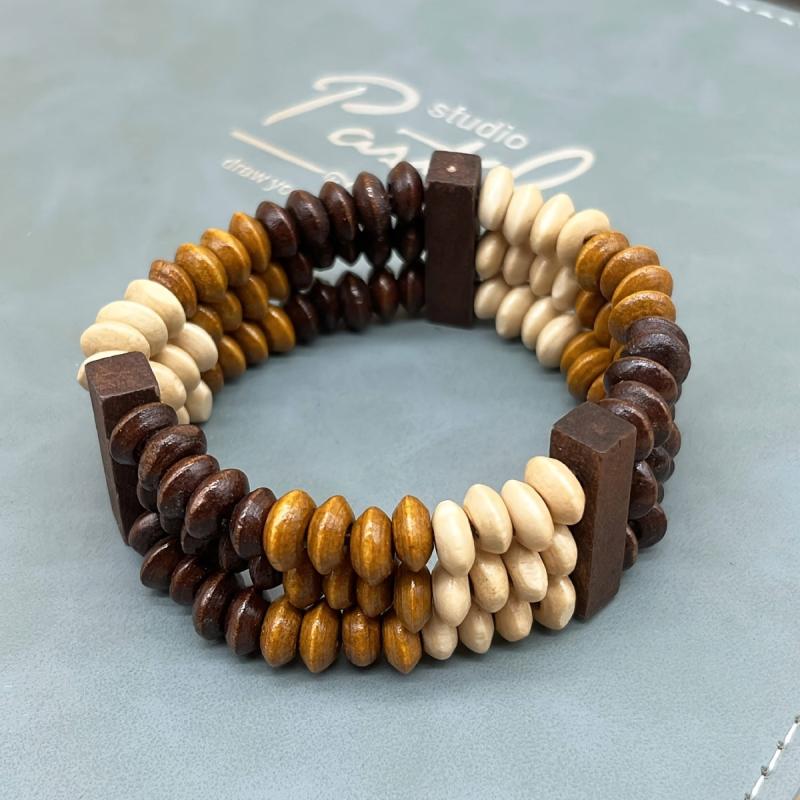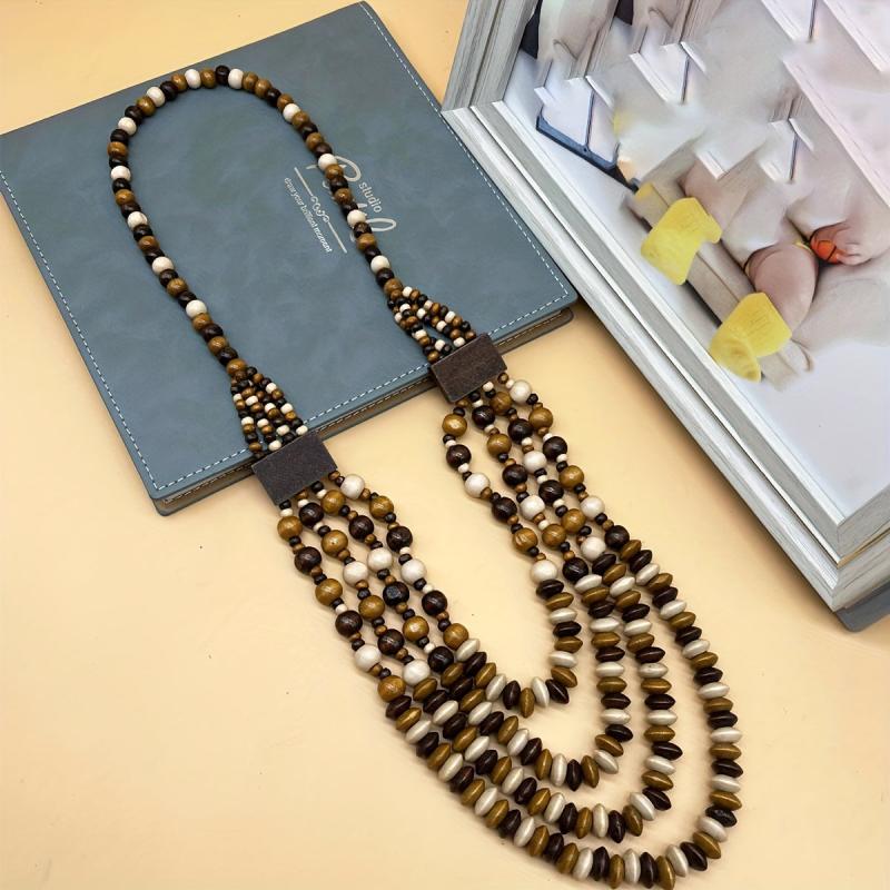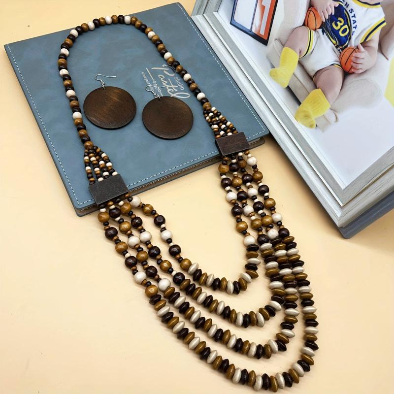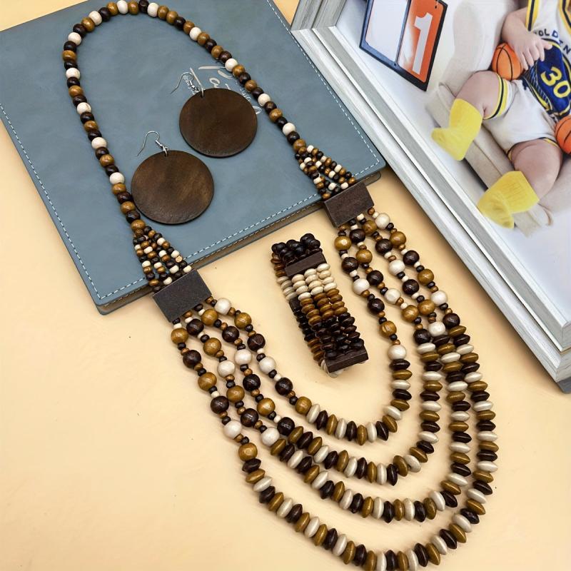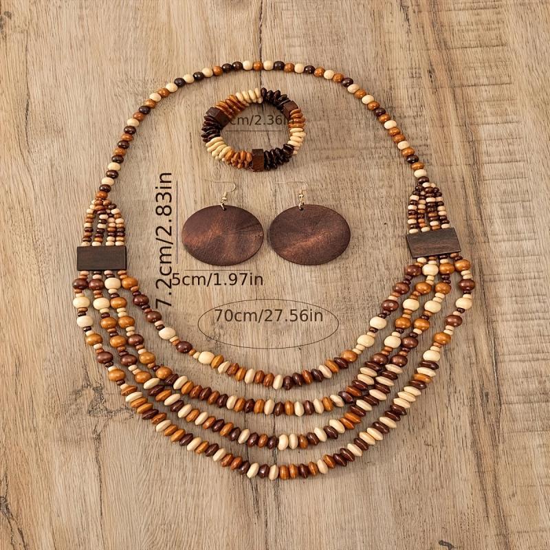 Add a touch of bohemian style with this 4pcs wooden bead set including necklace, earrings, and bracelet. The set features brown, cream, and natural wooden beads, ideal for beach holidays.