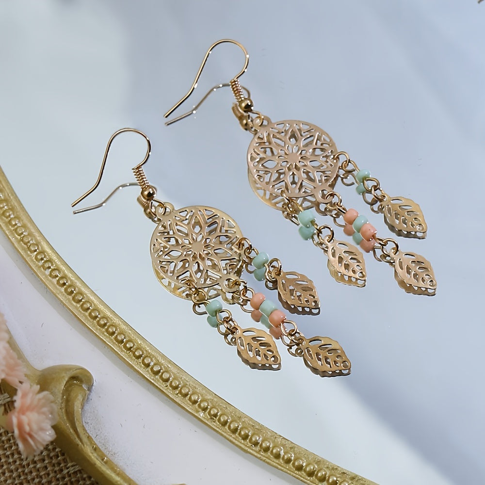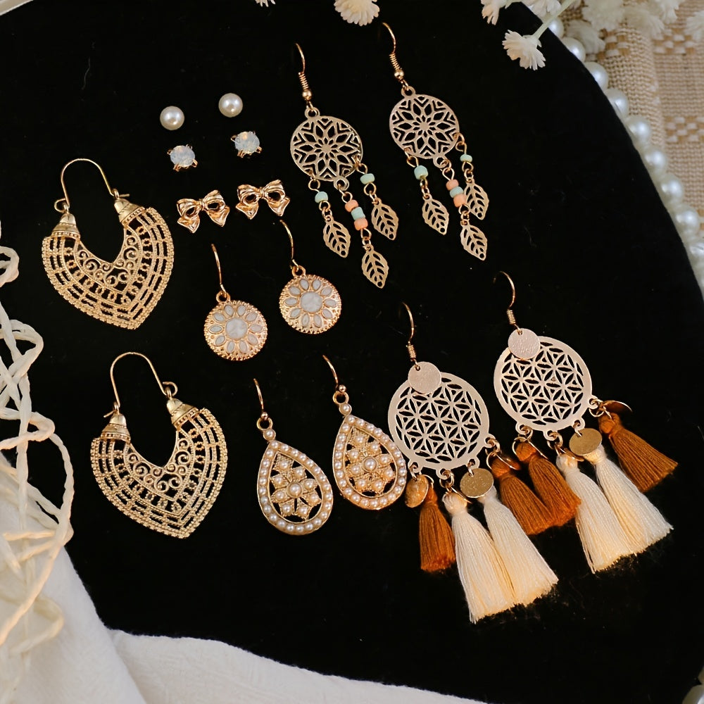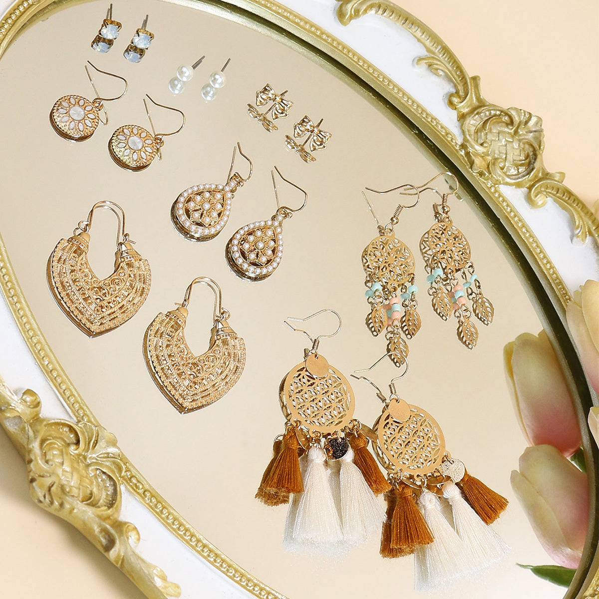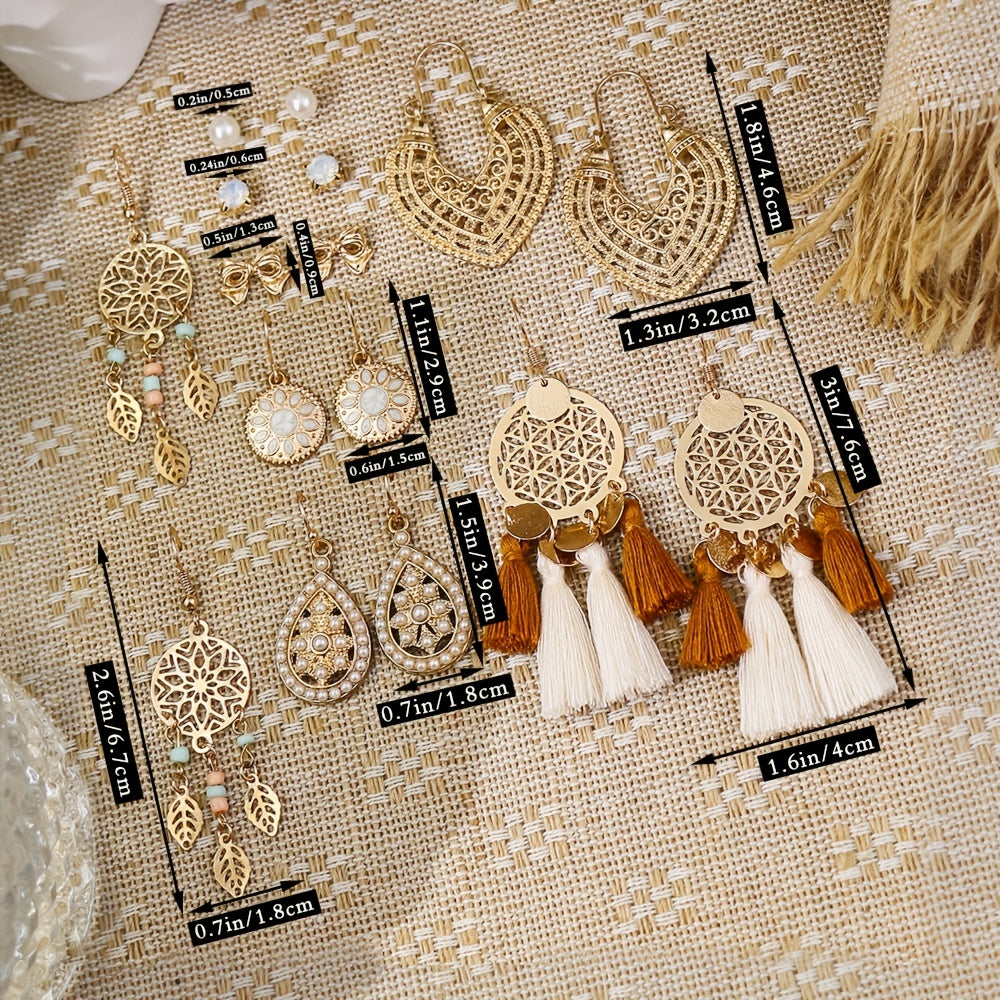 Enhance your boho style with this set of 8 pairs of earrings. Includes golden stud earrings with pearl embellishments and geometric cutout drop earrings.