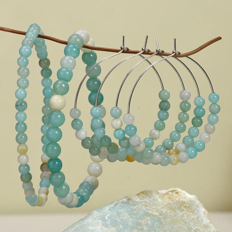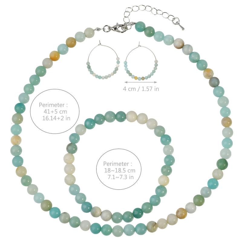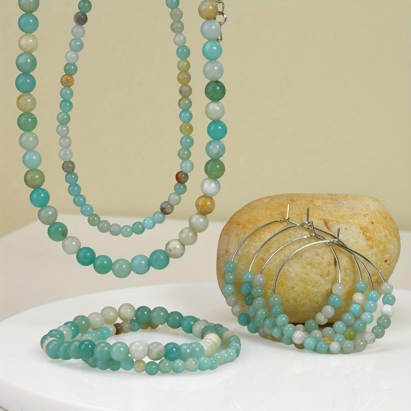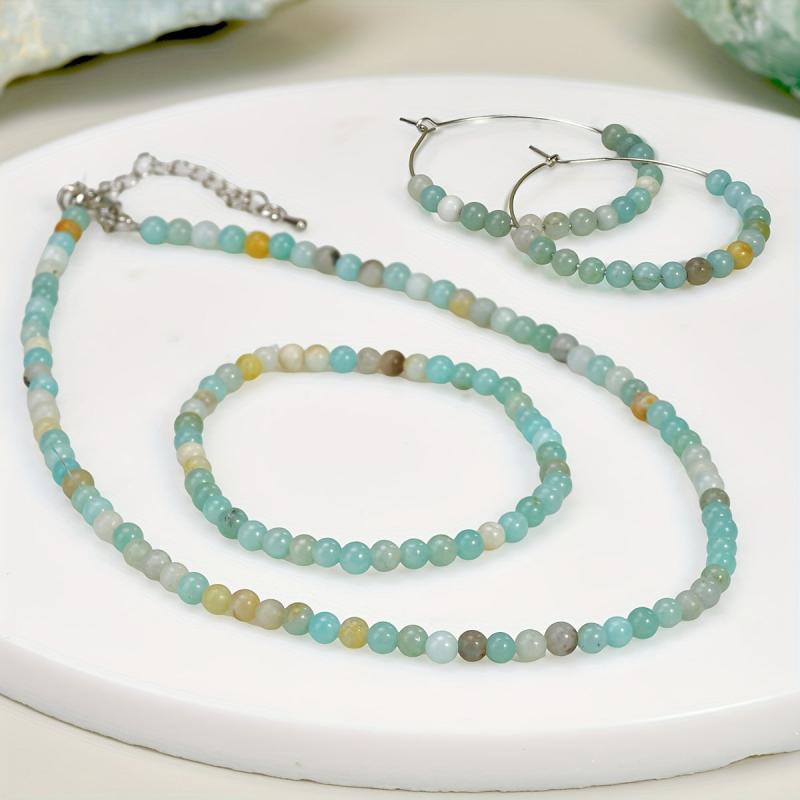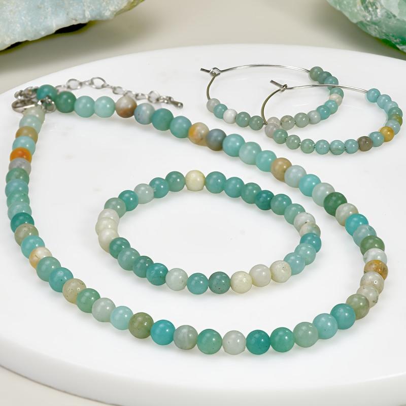 Handcrafted bohemian style jewelry set featuring amazonite stones, perfect for spring & summer vacation outfits.