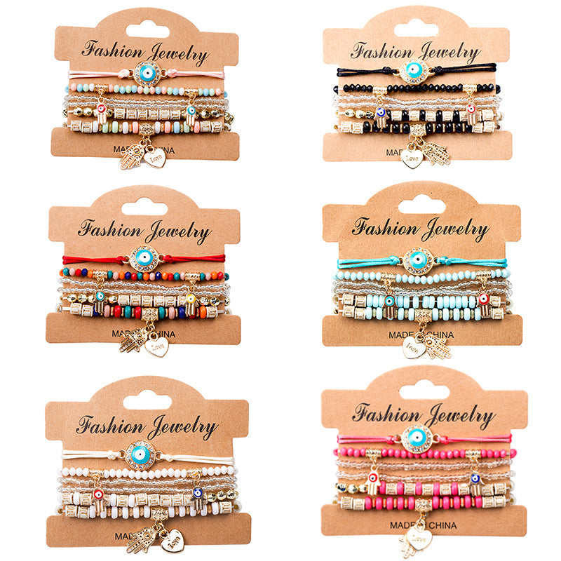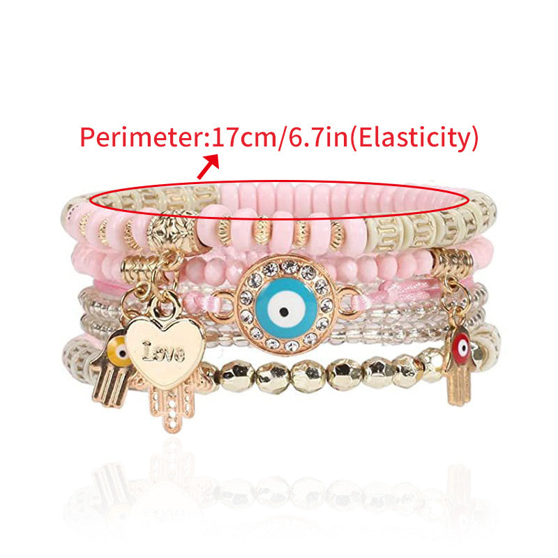 This boho layered bracelet features colorful beads and a devil's eye hand shaped pendant. It is a versatile accessory suitable for women and girls.